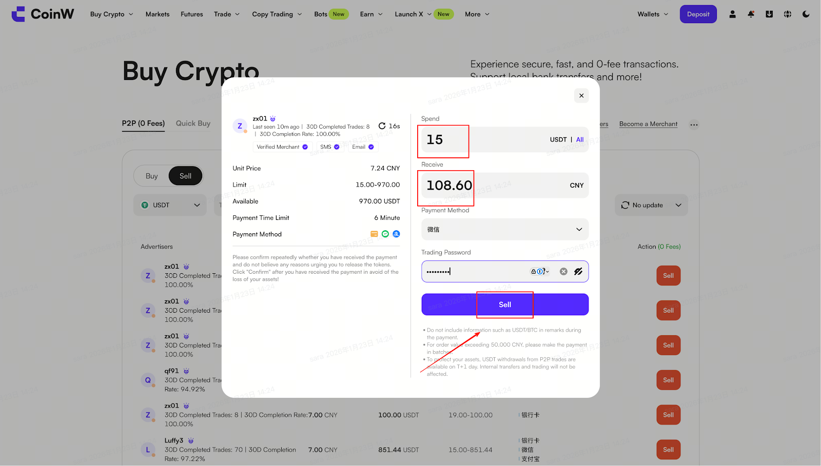 After selecting a payment method, enter the transaction password and click the "Sell" button