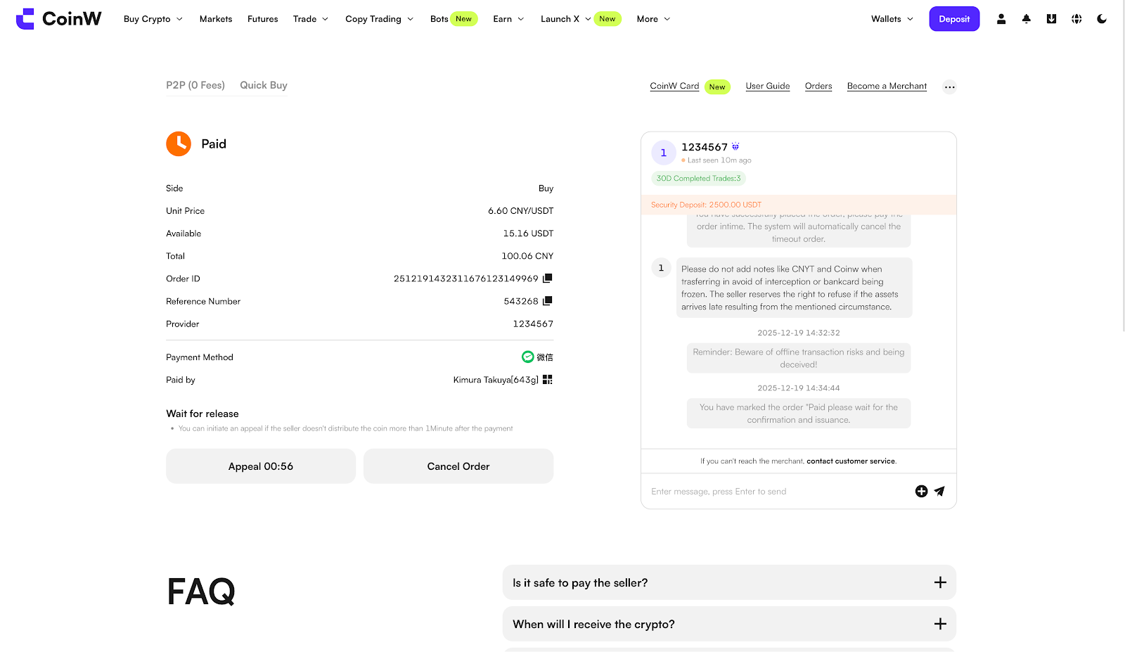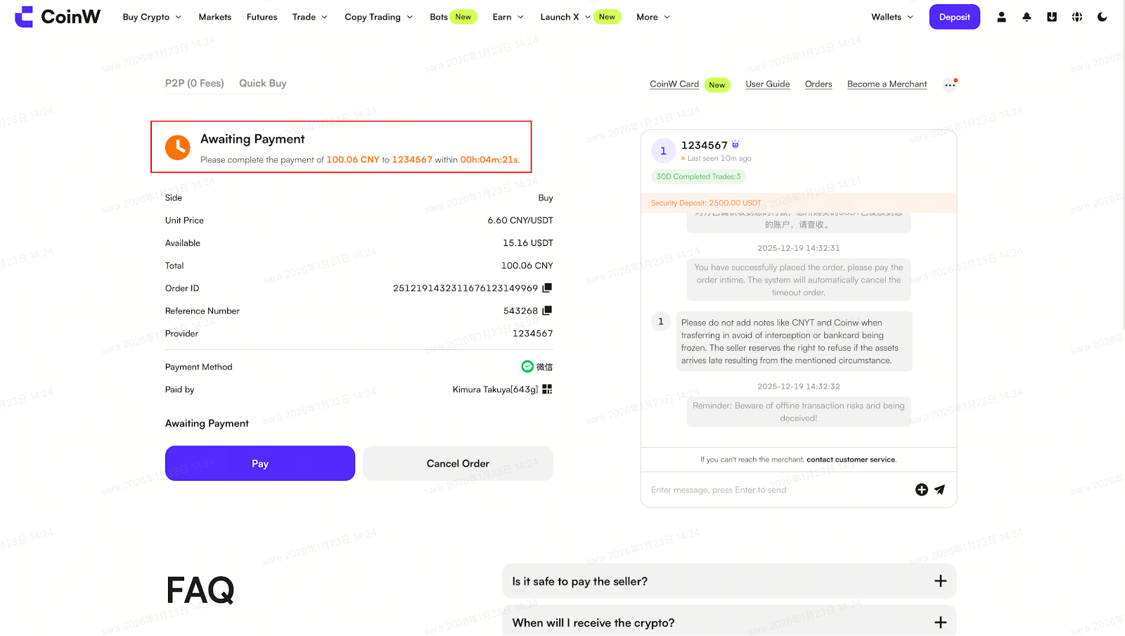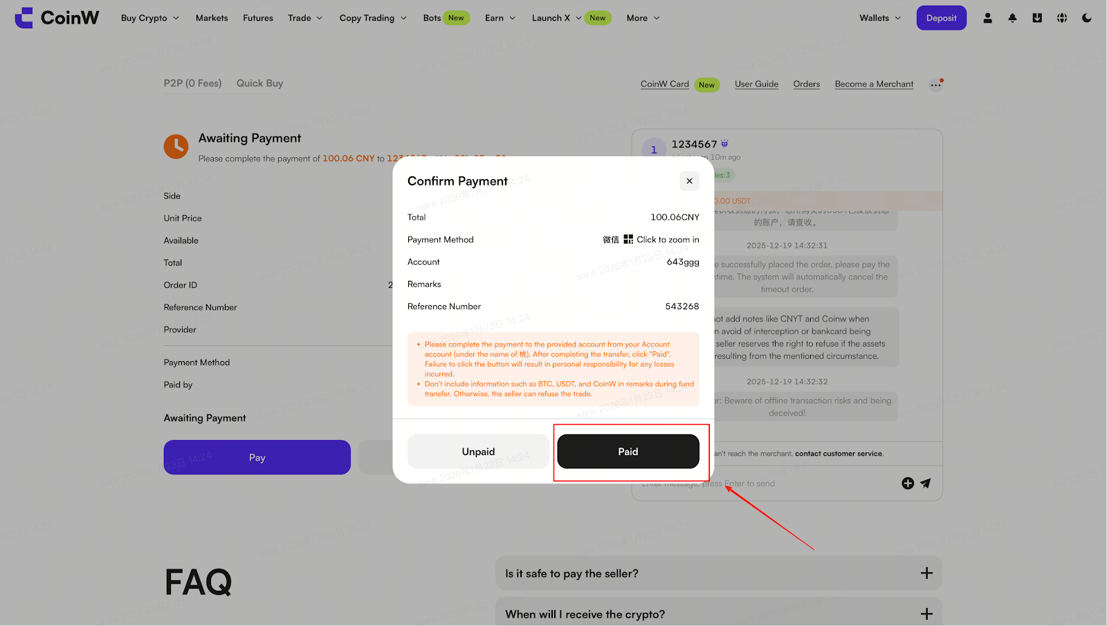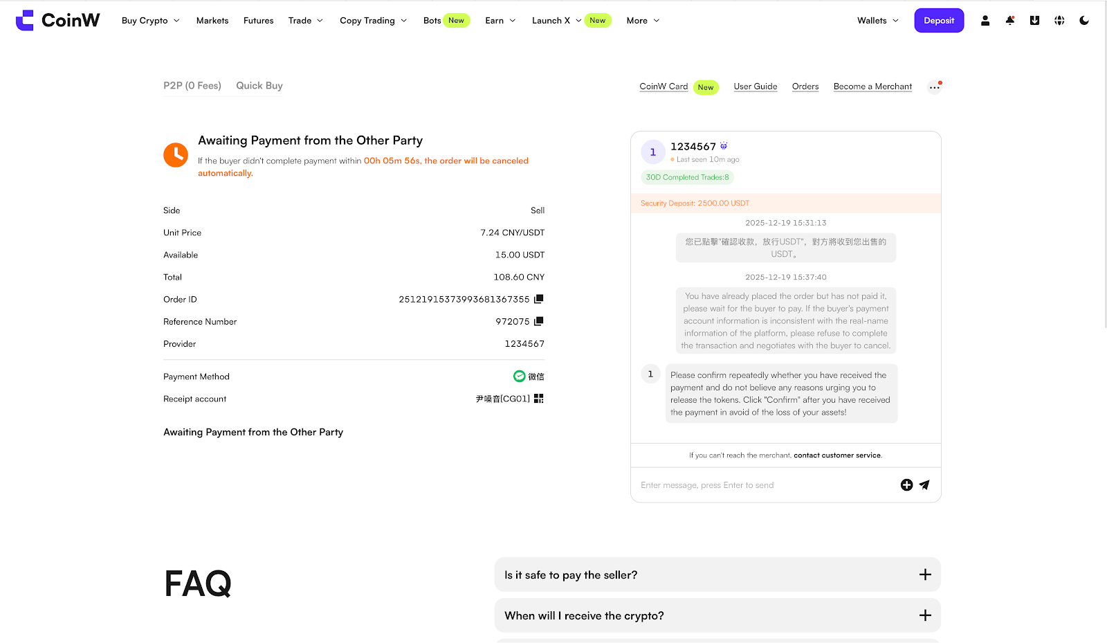 CoinW OTC adopts a multi-layered risk control framework, including real-name verification(kyc) for both trading parties and real-time risk monitoring, to comprehensively improve transaction security and transparency. In addition, our platform supports multiple localized payment methods and offers intelligent order matching and instant chat functions, enabling buyers and sellers to complete transactions smoothly and efficiently.