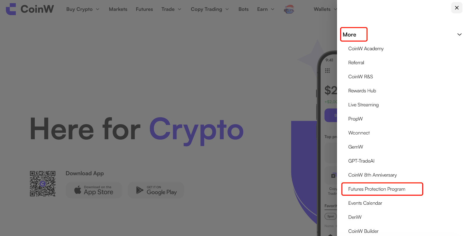 Log in to the CoinW website and select More → Futures Protection Program from the top navigation bar.
