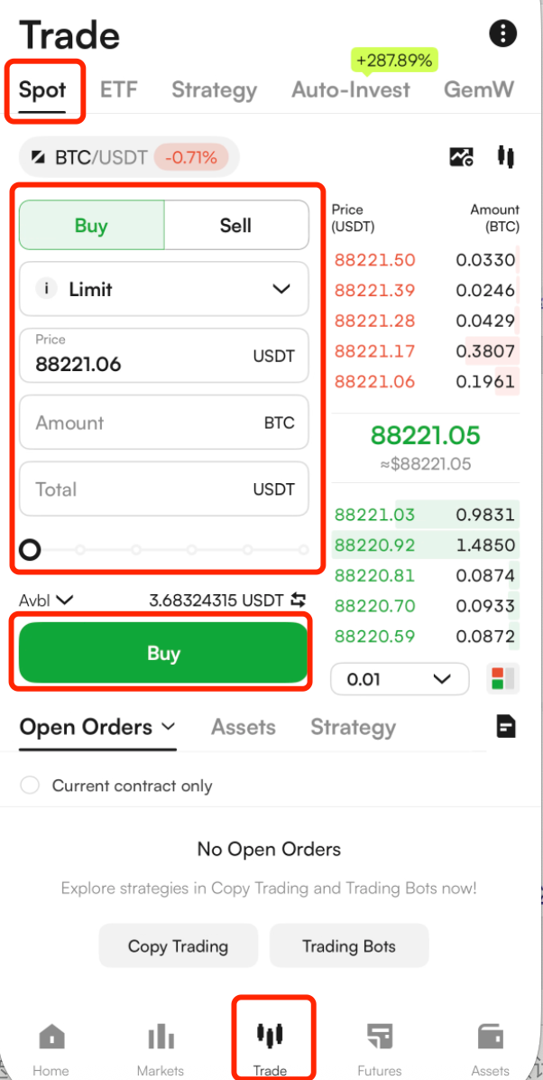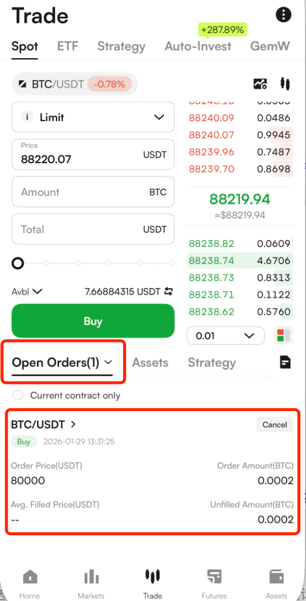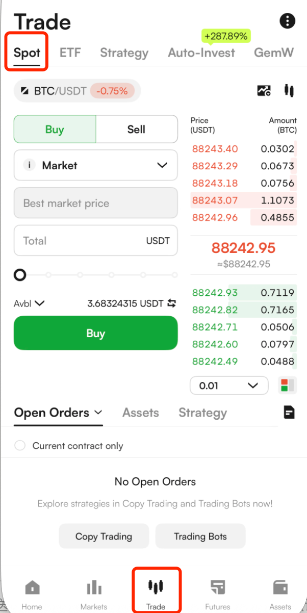 Spot trading refers to the buying and selling of crypto at the current market price (spot price). Once an order is filled, the corresponding assets are usually delivered immediately. Users may also place orders in advance so that trades are automatically executed when the price reaches a specified spot price.