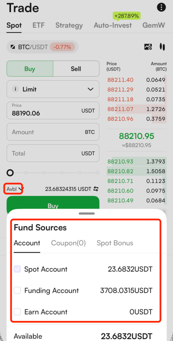 Please note: By default, the source of funds may include your Spot, Assets, and Earn accounts. You may also click the “Available” link to select the specific account to be used as the funding source.