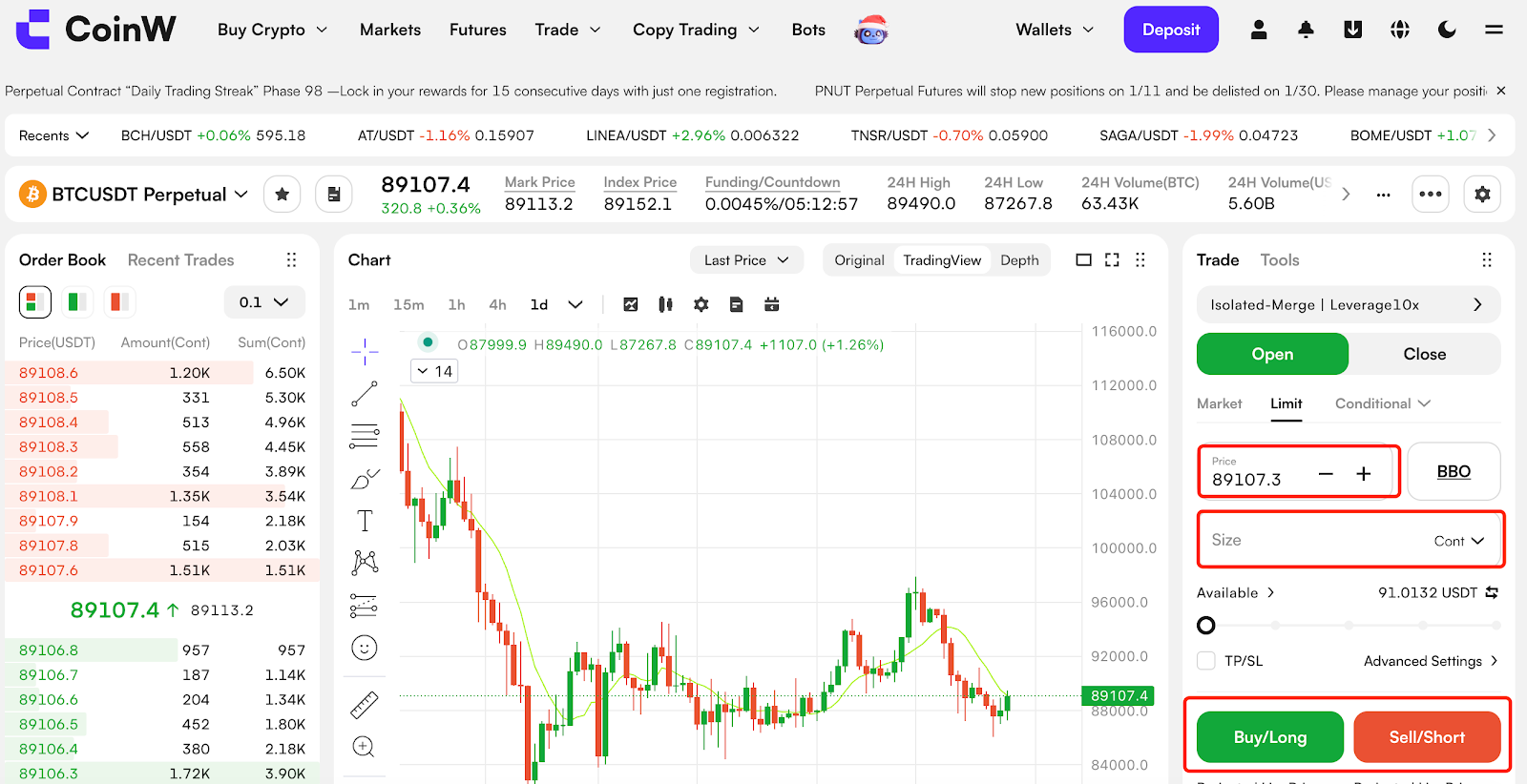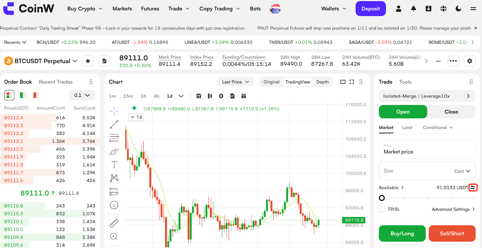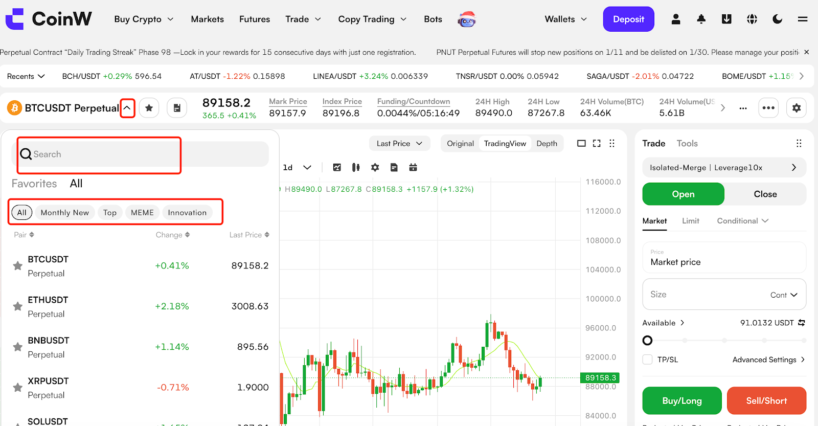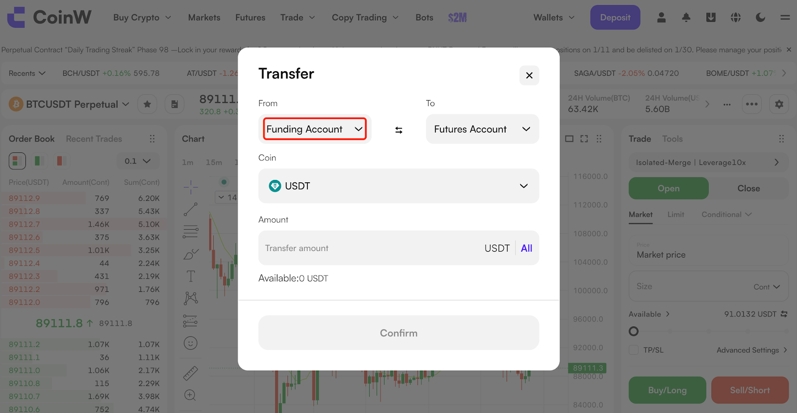 Log in to the CoinW website and click Futures in the top navigation bar.