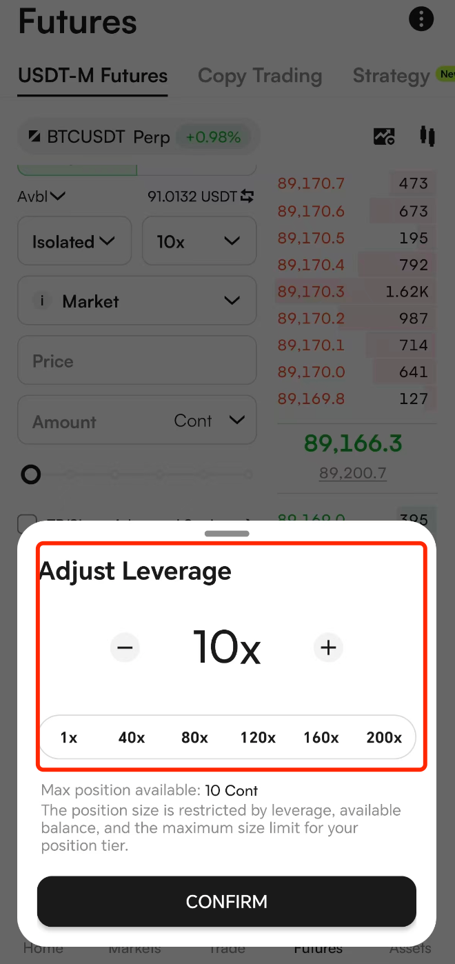 Leverage: Leverage allows you to open a large position with a small amount of capital. During futures trading, you only need to commit a small portion of funds to open a position equivalent to 1 BTC. By comparison, spot trading does not support leverage.