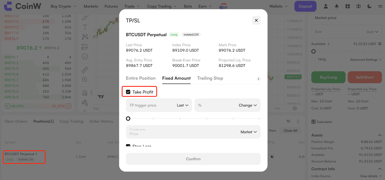 After the position is opened. You can view your position details, monitor the liquidation price or set take-profit (TP) and stop-loss (SL) under "Positions".