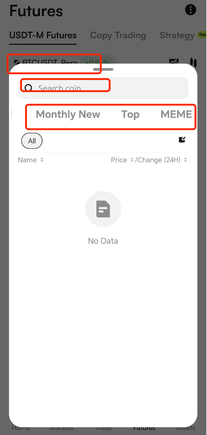 Click the trading pair on the upper-left corner and search or browse your preferred futures pairs.