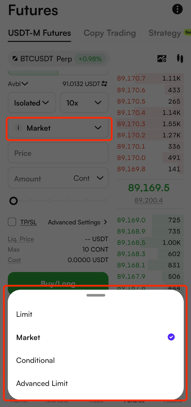 Choose an order type from the panel. There are four available options: limit order, market order, conditional order and advanced limit order.