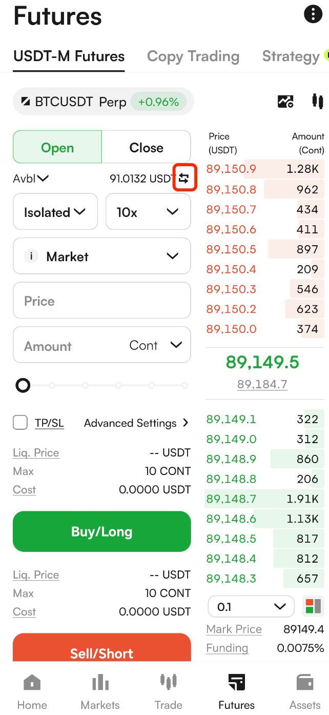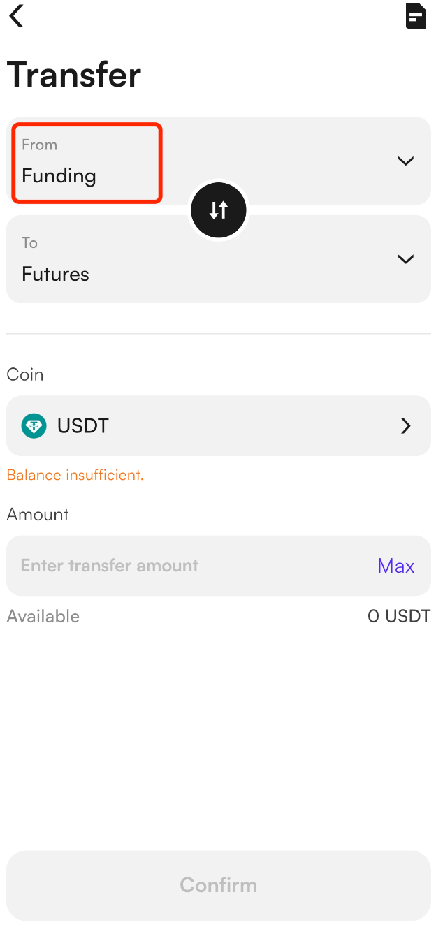 Make sure you have sufficient USDT balance in your futures account. If not, you can click the "Transfer" icon as shown below to move funds from another account your futures account.