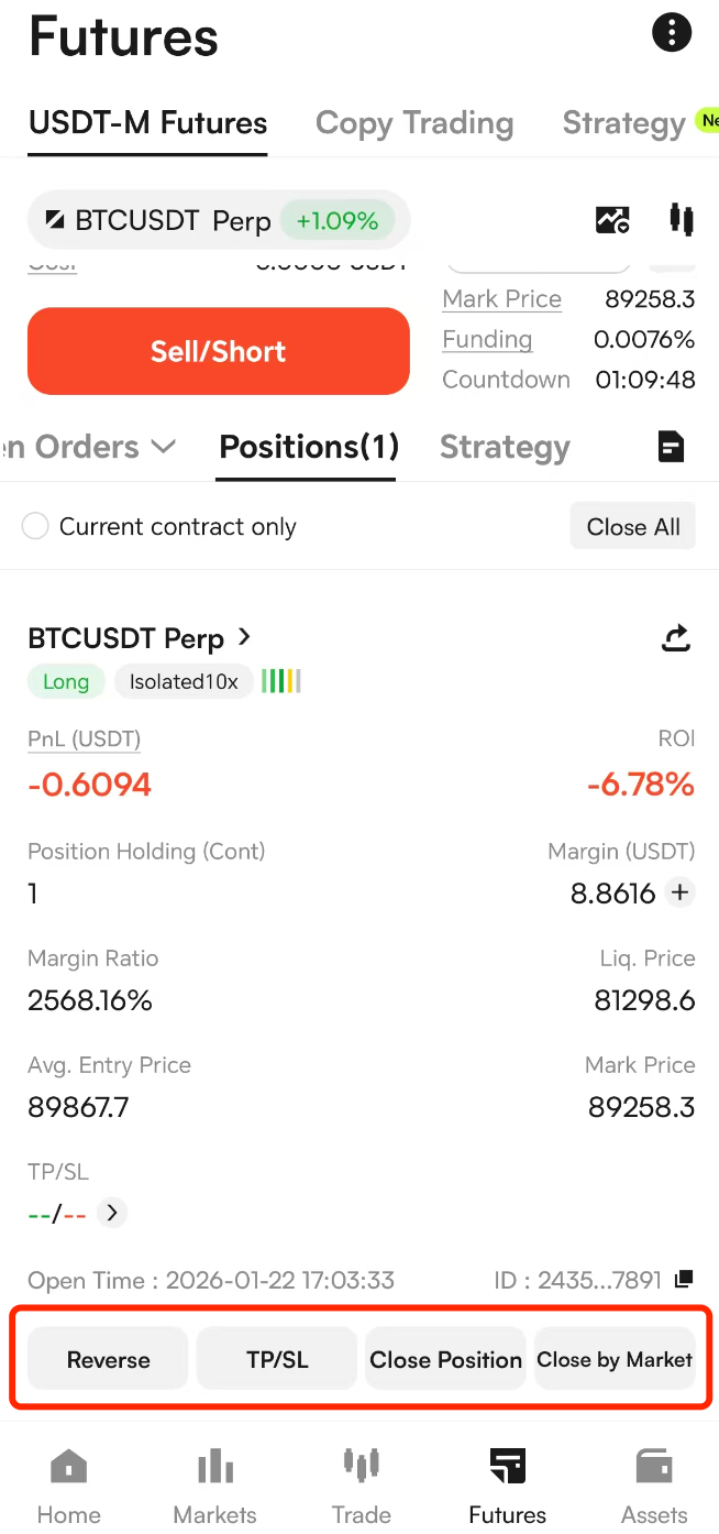 After the position is opened. You can view your position details, monitor the liquidation price or set take-profit (TP) and stop-loss (SL) under "Positions". When your target profit is reached, click "Close" and choose an order type (market order, limit order, advanced limit order) or simply click "Close by Market" to close your position. If you choose "Close by Market", your order will be closed at market price.