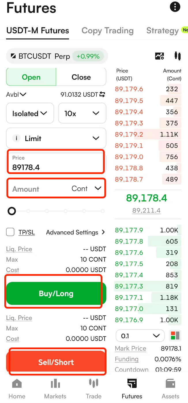 Enter your order price and amount, confirm the direction, then click Buy/Long or Sell/Short to place the order.