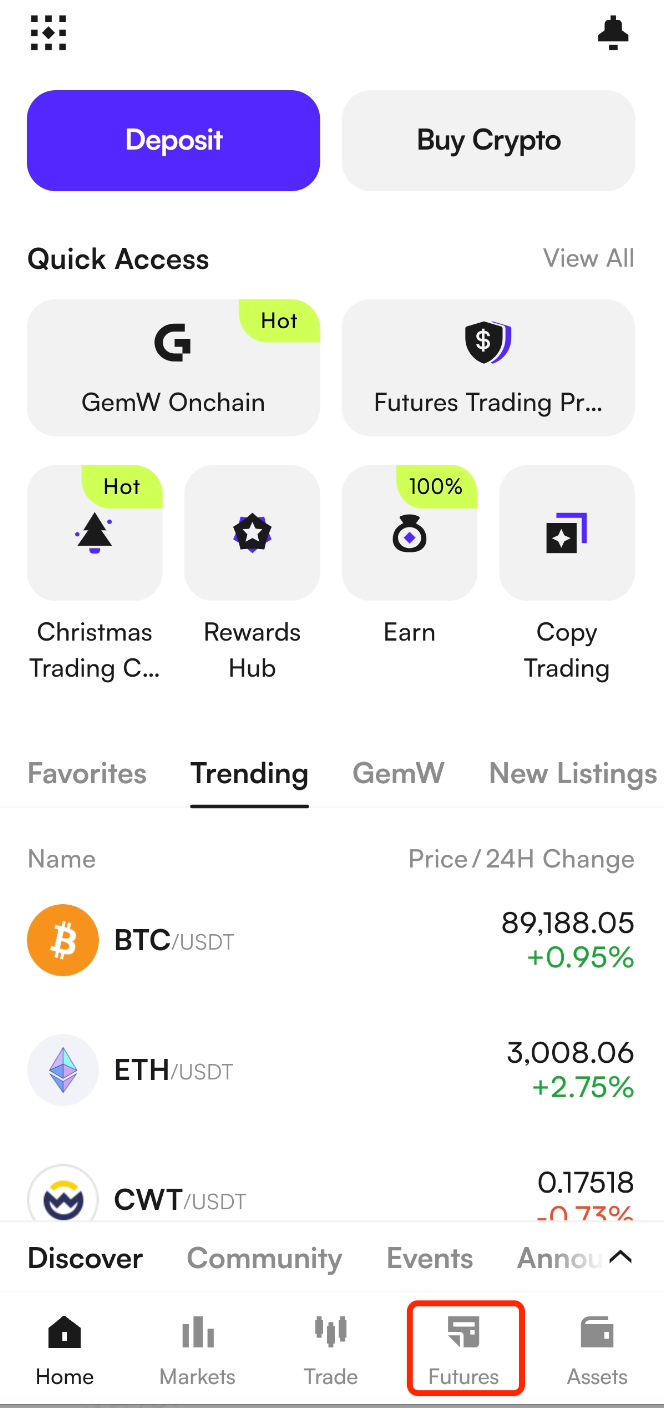Open the CoinW app and tap Futures on the bottom navigation bar.