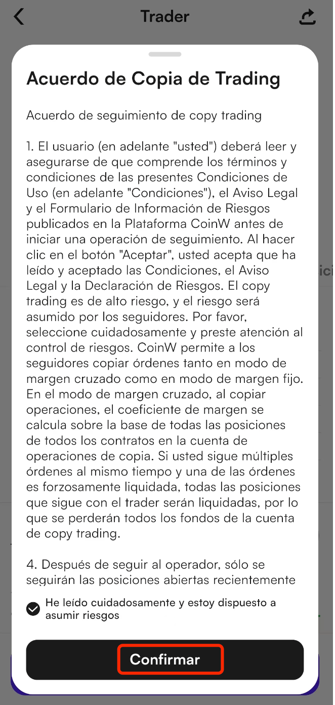 Si es la primera vez que sigues a un trader, aparecerá una ventana emergente mostrándote los términos. Lee estos términos y toca Confirmar para continuar.