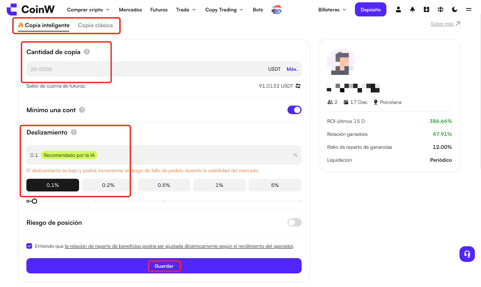 En la página de configuración, selecciona un modo de copy trading para copiar al trader. La plataforma actualmente soporta dos modos: Copiado Inteligente (Smart Copy) y Copiado Clásico (Classic Copy). El modo Copiado Inteligente está diseñado para principiantes y el modo Copiado Clásico es para usuarios avanzados. Completa la configuración de parámetros de copiado y haz clic en Guardar. Para más información sobre estos dos modos de copiado, revisa aquí: https://coinw.zendesk.com/hc/zh-cn/articles/39386880761113.