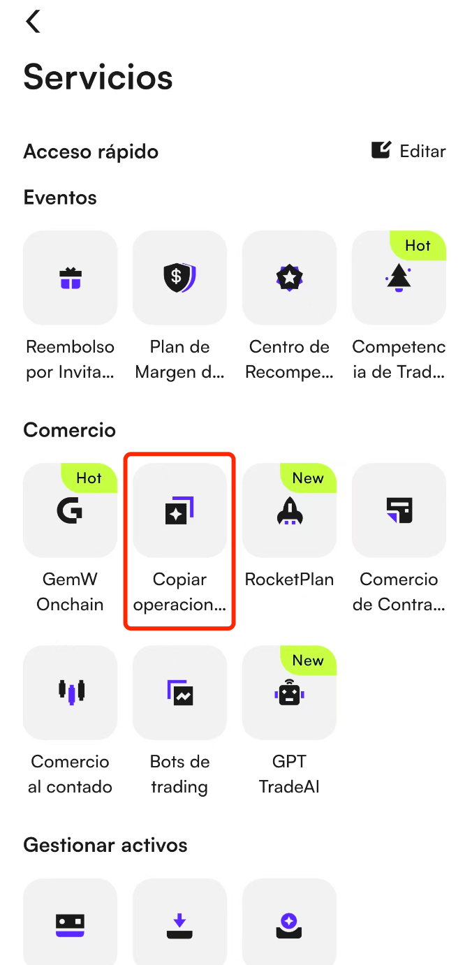 En la página de inicio, toca Ver Todo debajo de Acceso Rápido, luego toca Copy Trading para entrar al mercado de copy trading.