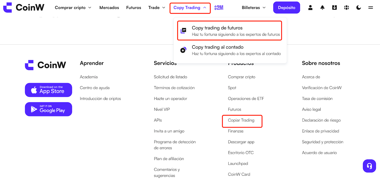 Visita nuestro sitio web oficial y ve a Copy Trading → Copy Trading de Futuros en la barra de navegación, o desplázate hasta el final de la página y haz clic en "Copy Trading" para entrar al mercado de copy trading.