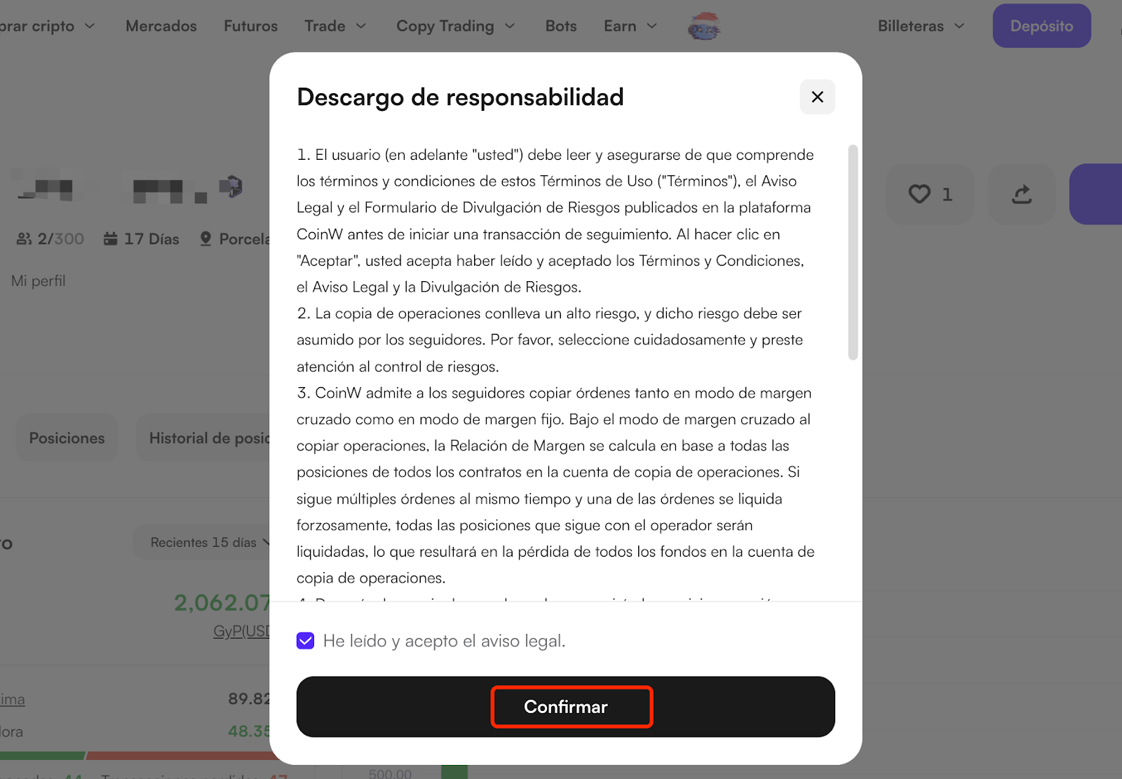 Si es la primera vez que sigues a un trader, aparecerá una ventana emergente mostrándote los términos. Lee estos términos y haz clic en Confirmar para continuar.