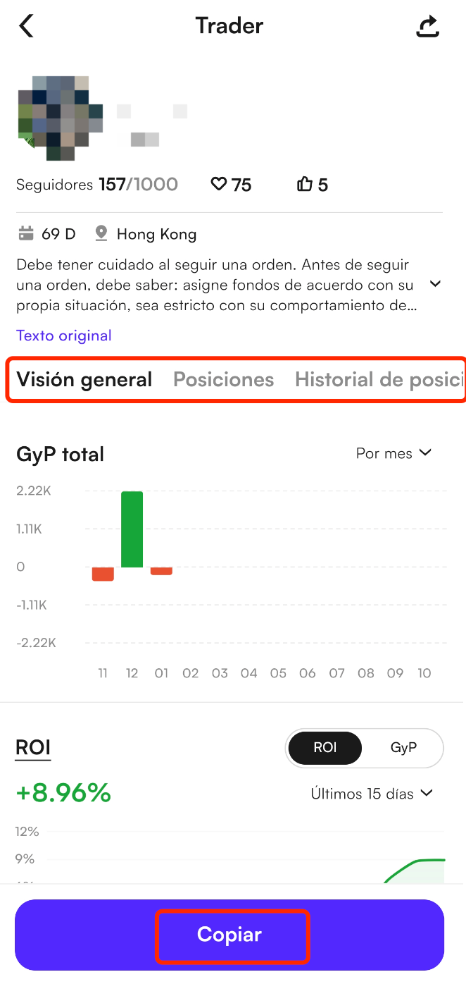 En la página de perfil del trader, revisa el rendimiento del trader y toca Copiar.
