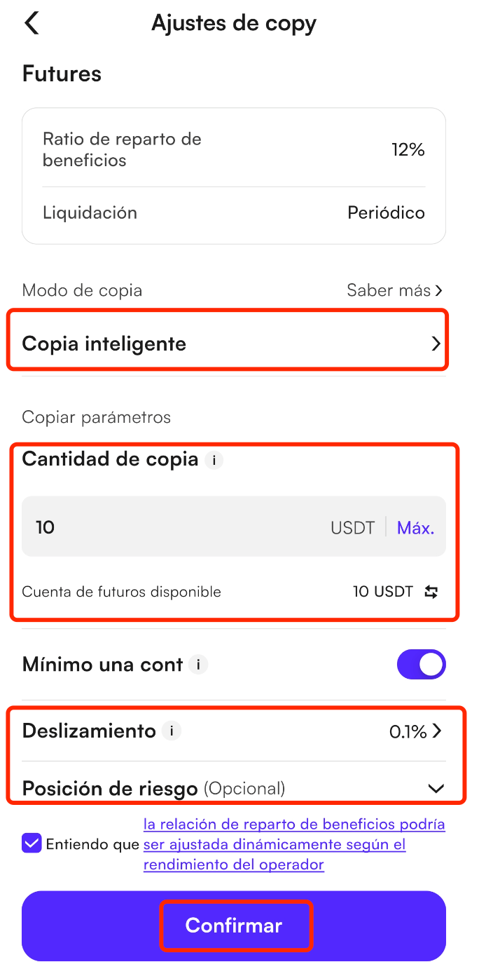 Puedes configurar tu monto de copiado, modo de posición y parámetros de riesgo para gestionar tu riesgo según tus preferencias.