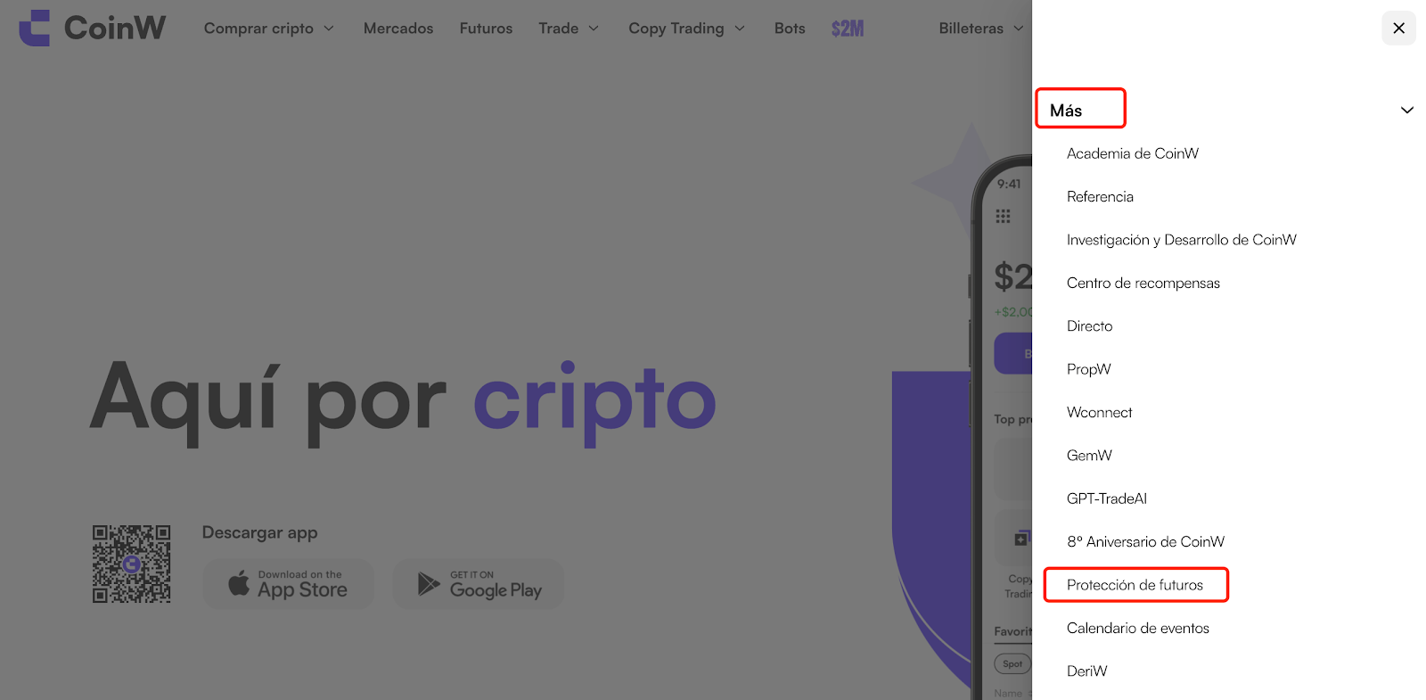 Inicie sesión en el sitio web de CoinW y seleccione Más → Programa de protección de futuros en la barra de navegación superior.