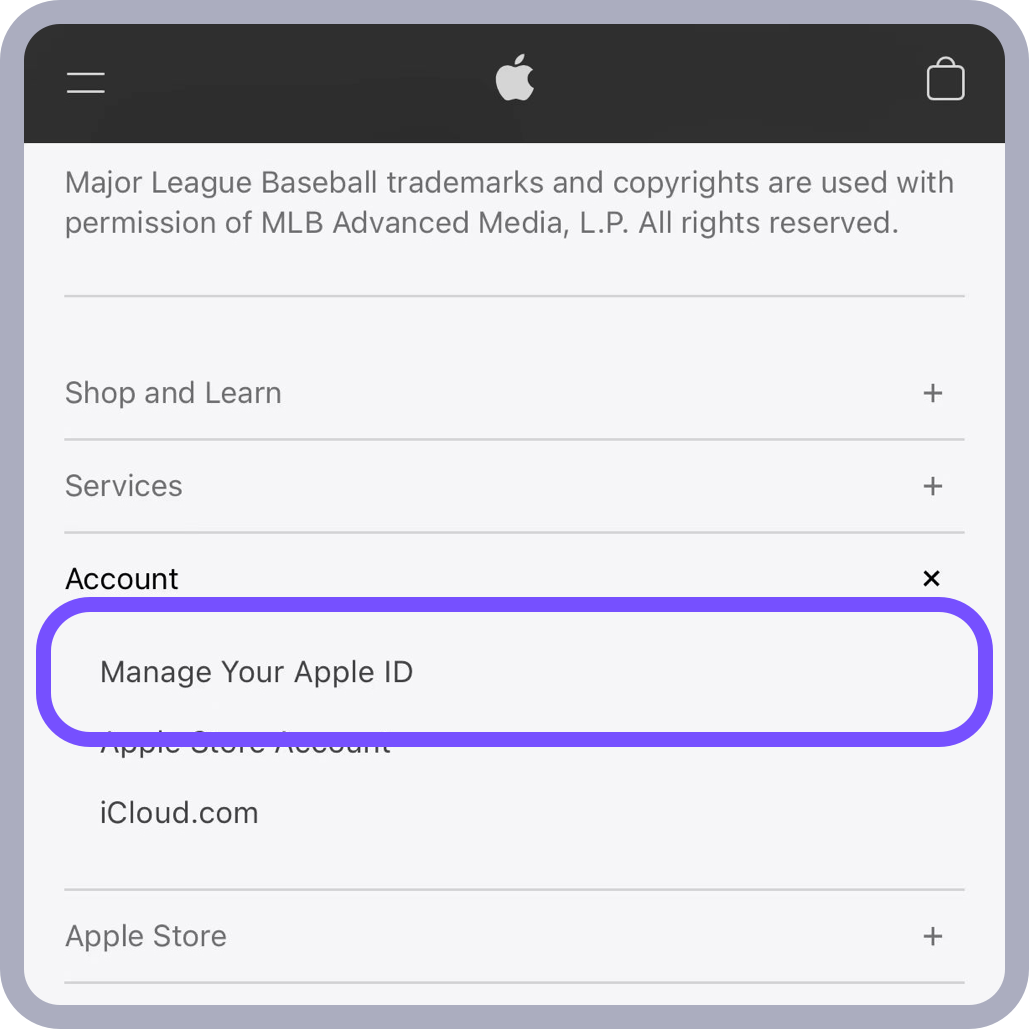 2. 将页面拉到最底部 >> 点击 Account >> Manage Your Apple ID >> 在新页面顶部点击 Create Your Apple ID