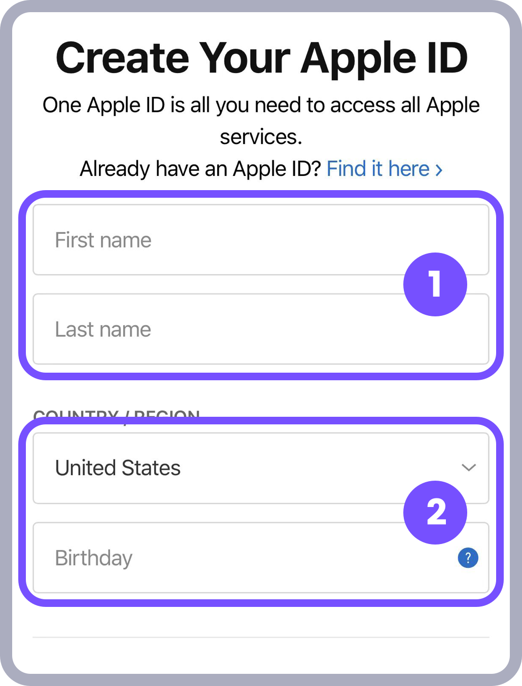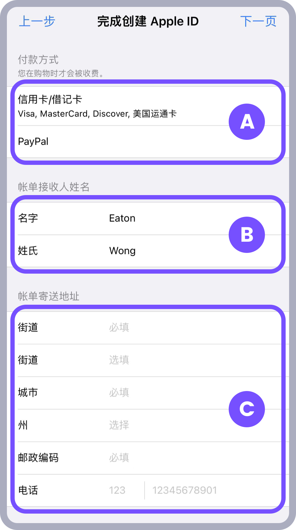 * 该页面的邮箱需要填写未注册过 Apple ID 的新邮箱;国家需要选择 United States;生日最好选择18年以前的日期
