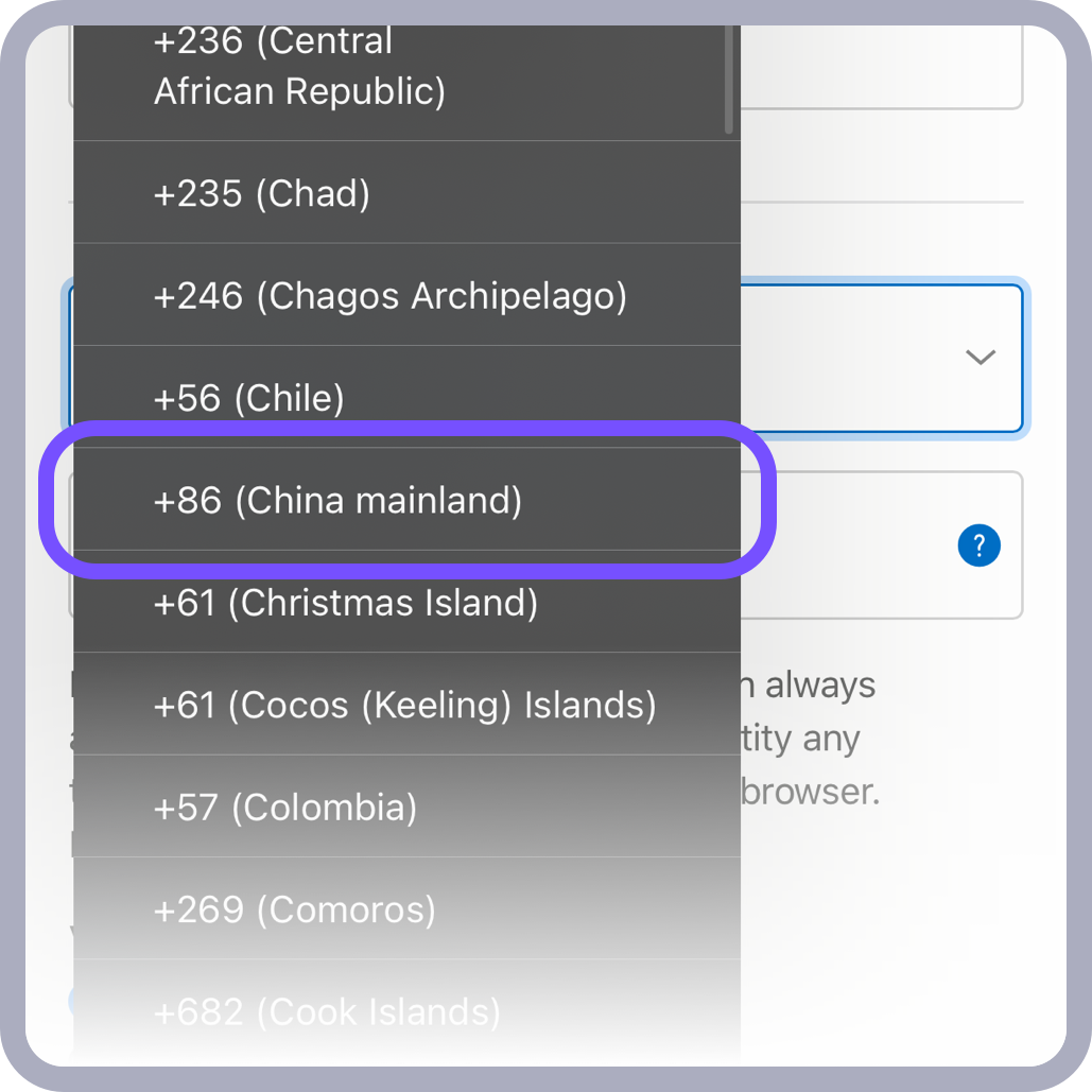 例:中国大陆号码选择“+86中国大陆”选项