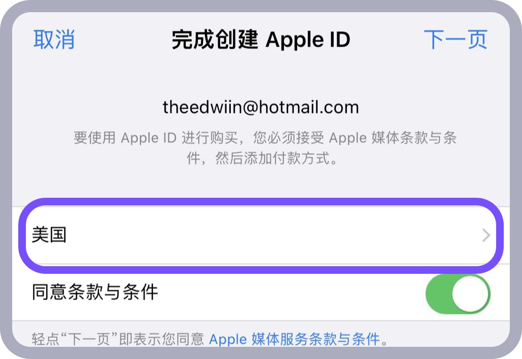 3. 选择 United States >> 选中同意按钮 >> 点击下一页