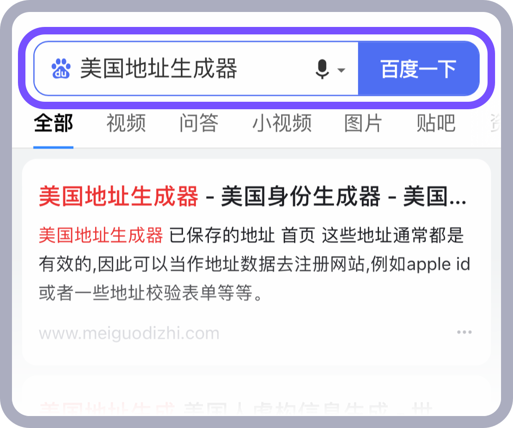 在百度中搜索“美国地址生成器” >> 在结果中选择一家可以生成美国虚拟身份信息的网站进行生成即可