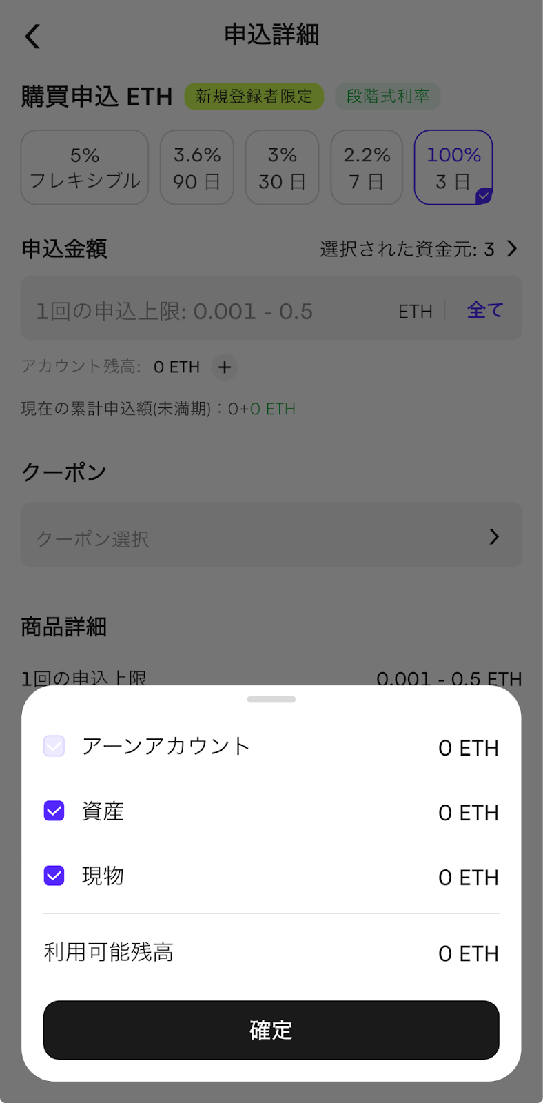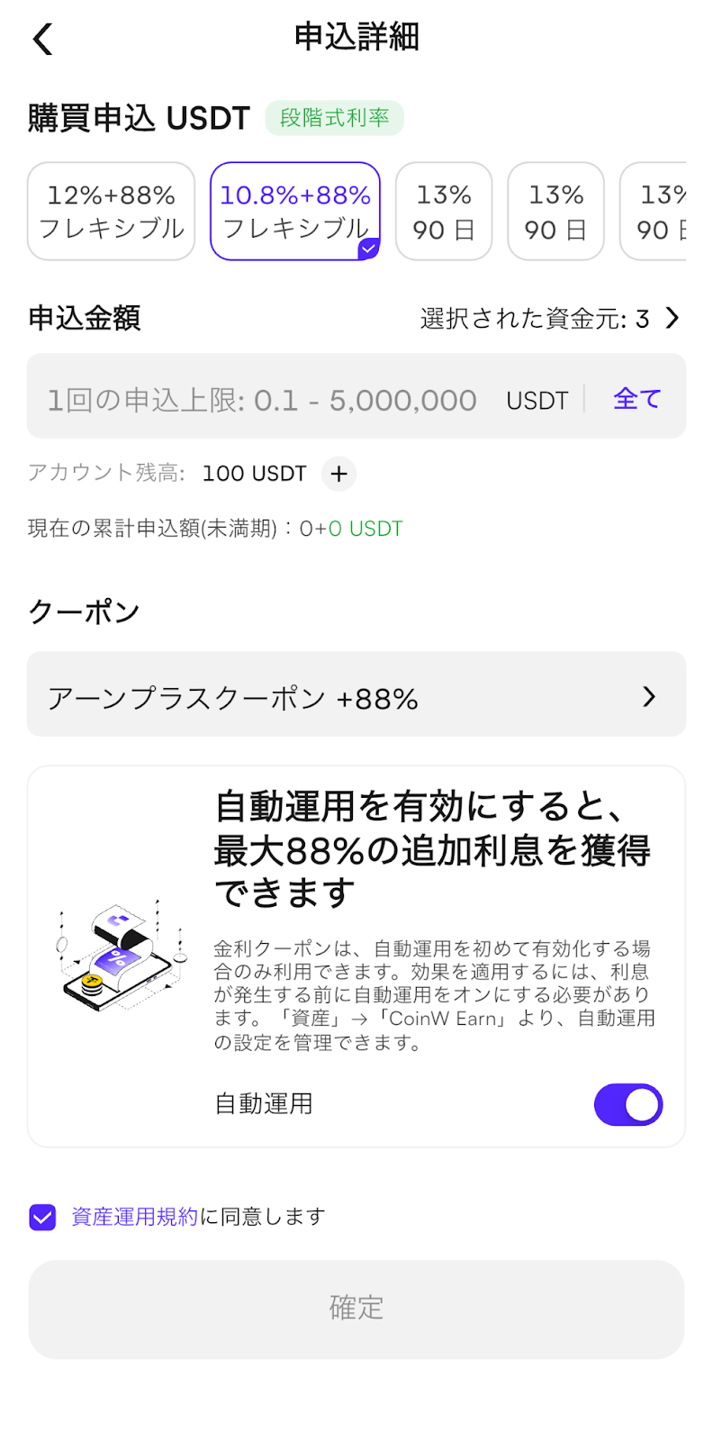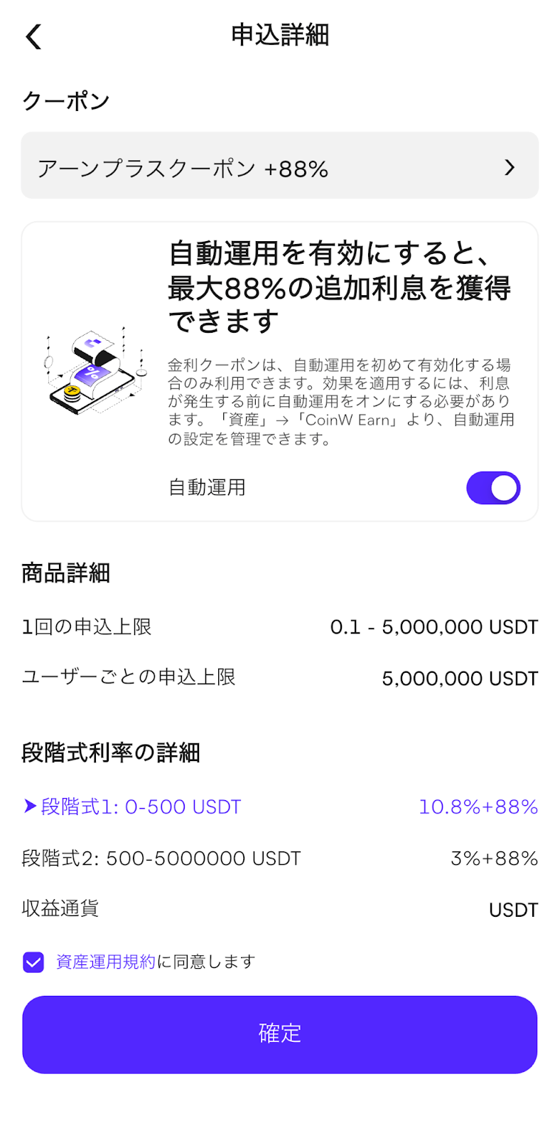 Earn金利クーポンをお持ちの場合は、該当クーポンにチェックを入れることで適用されます。最後に【資産運用規約に同意します】にチェックを入れ、【確定】をタップすると、申込が完了します