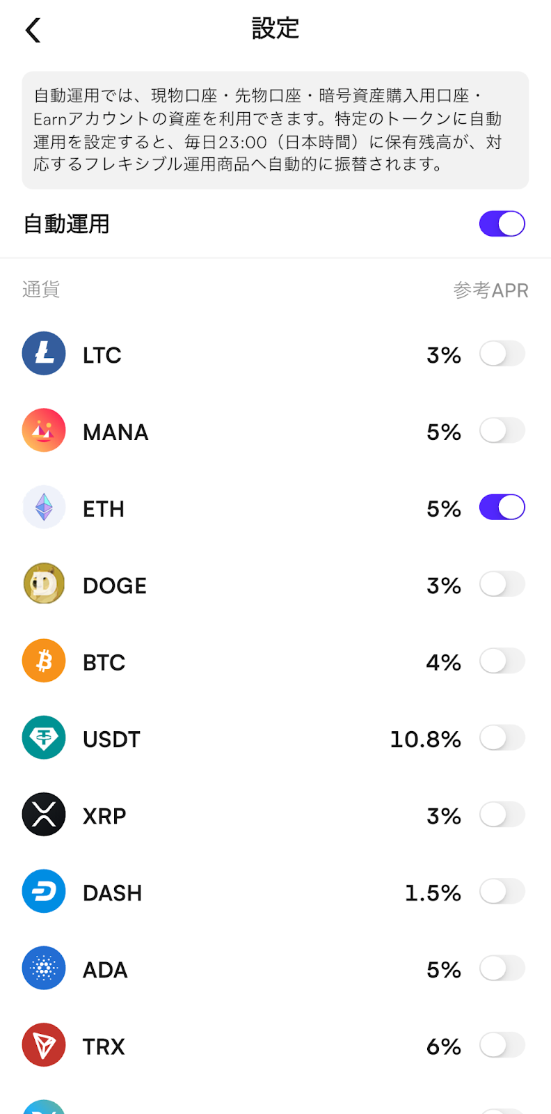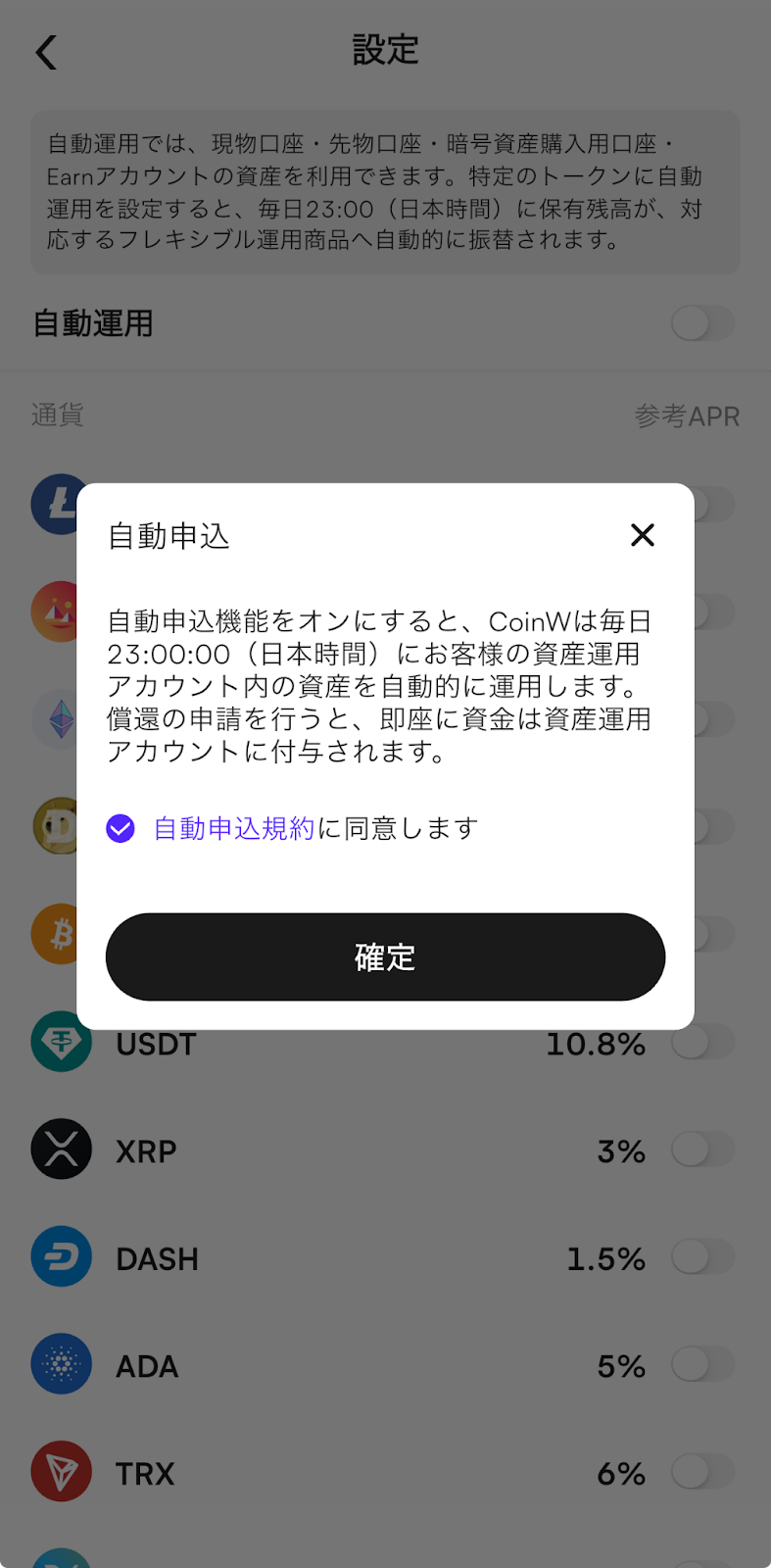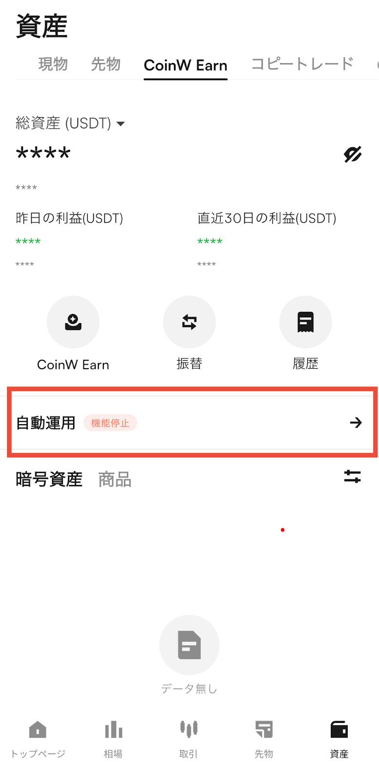 【資産】>【CoinW Earn】>【自動運用】へ進み、