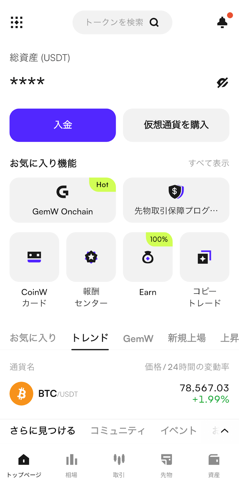 ホーム画面から【Earn】をタップし、CoinW Earn 「簡単に稼ぐ」機能ページへ進みます。