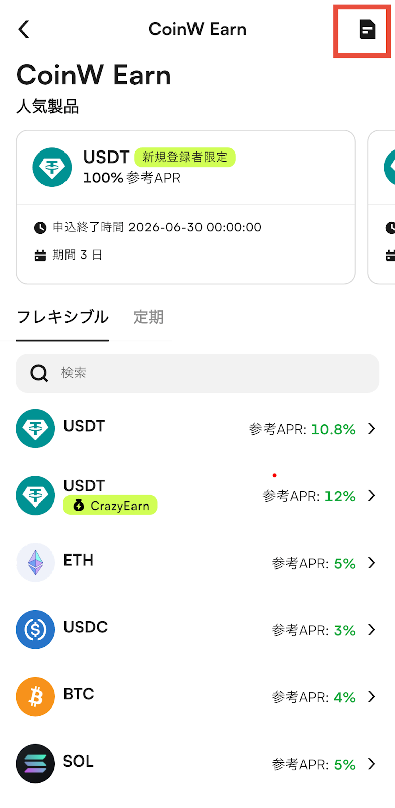 申込み完了後、画面右上のアイコンをタップし【履歴】ページへ進むことで、【フレキシブルEarn/定期Earn】の参加状況を確認できます。また、【資産】>【CoinW Earn】>【履歴】ページからも、条件を指定して確認できます。