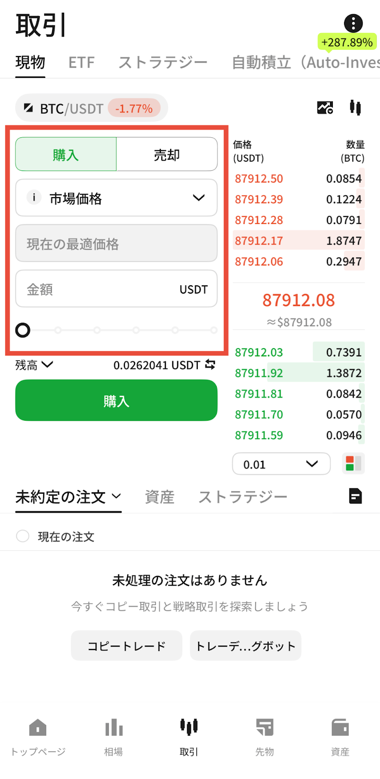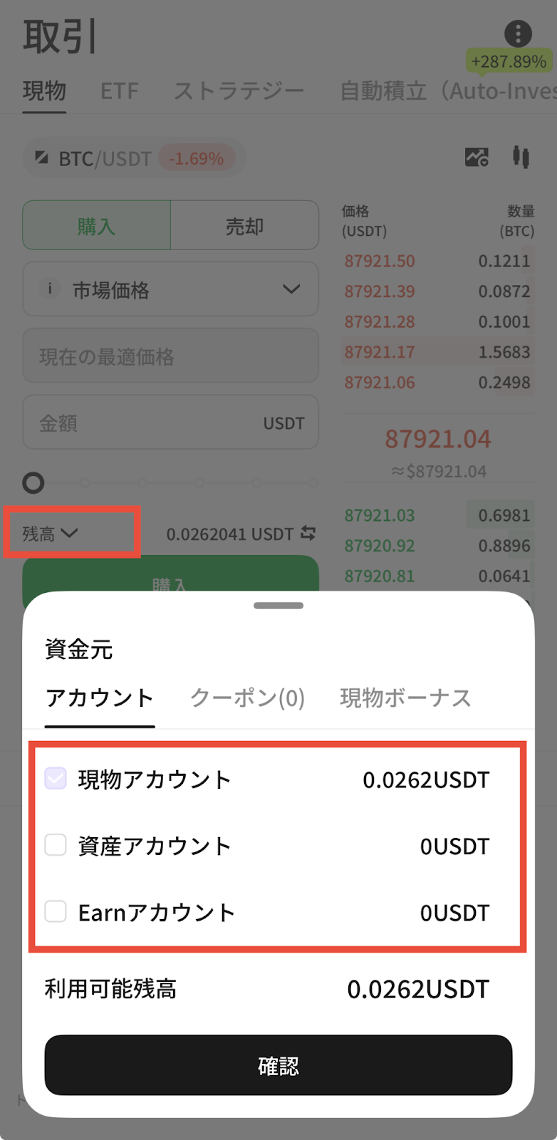 ※ご注意:初期設定では、資金は「現物アカウント・資産アカウント・Earnアカウント」から自動的に使用される場合があります。「残高」をタップすると、使用する口座を選択できます。