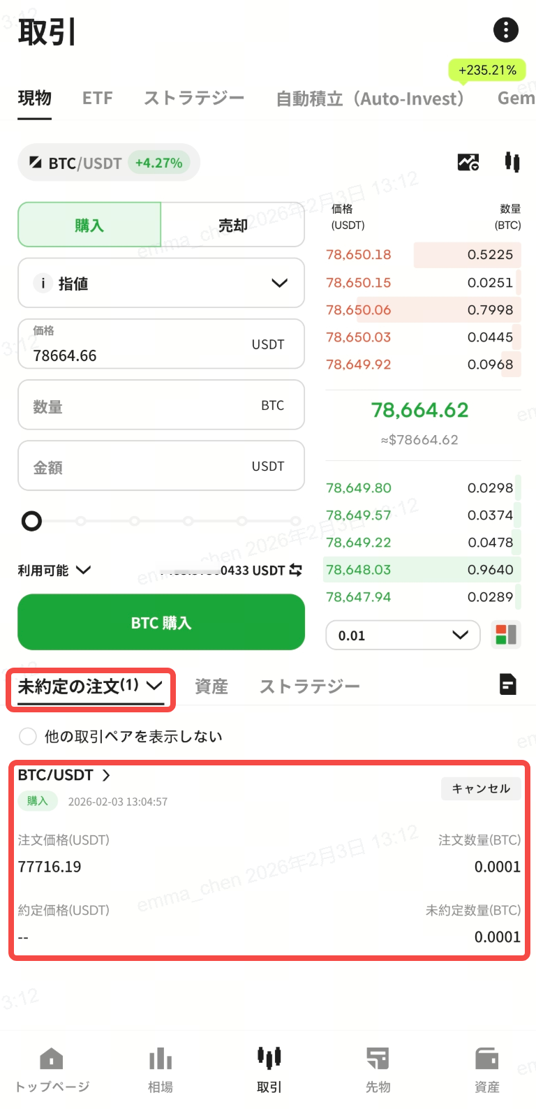 【数量】欄に購入したいBTC数量を入力、または下部の%を選択して、保有USDTの使用割合を指定します。
