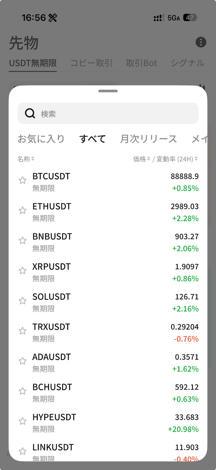 画面左上の取引ペア選択ボタンをタップし、取引したい暗号資産ペアを選択します。銘柄名で検索するほか、カテゴリー別での選択も可能です。
