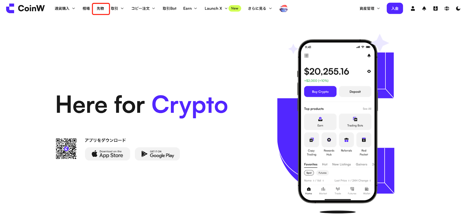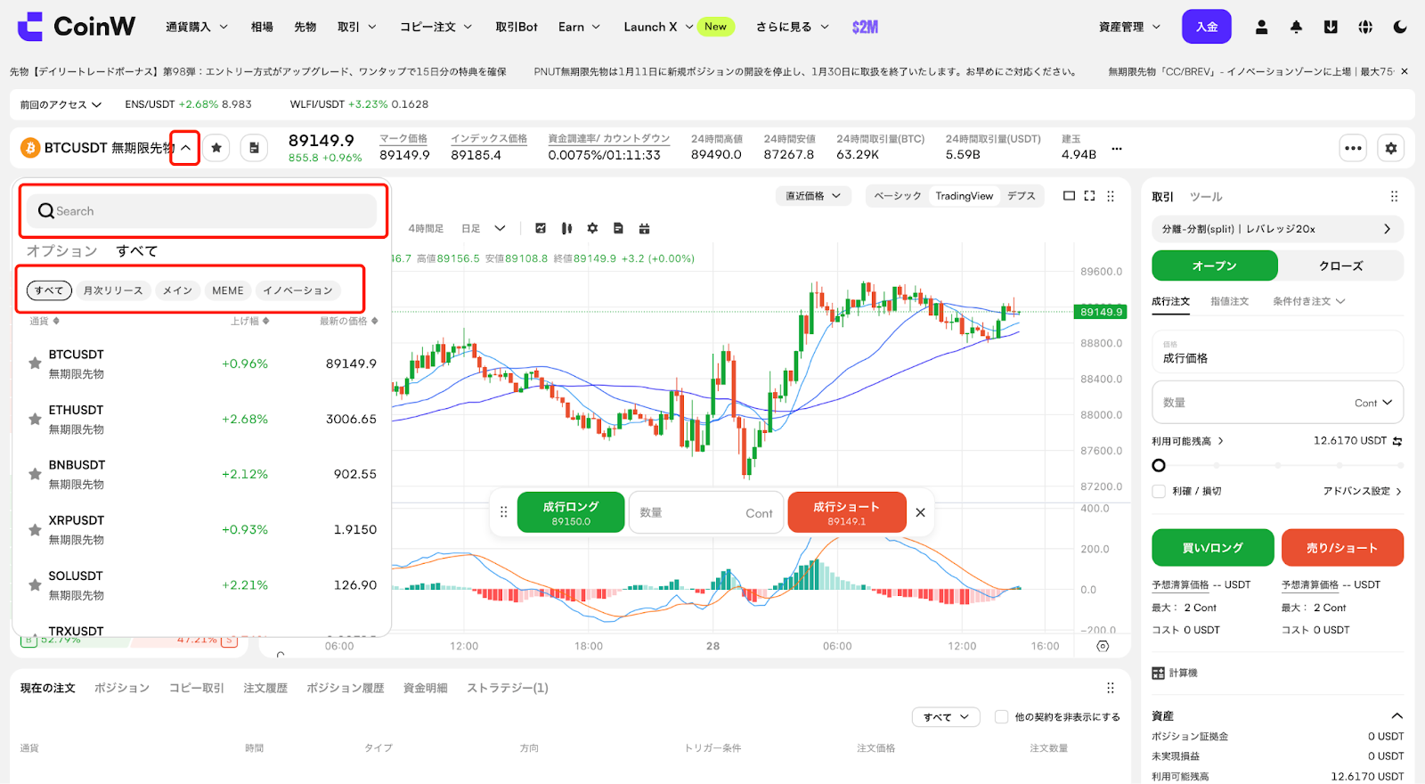CoinW公式サイトにログインし、ナビゲーションバーの【先物】をクリックすると、先物取引画面へ進みます。