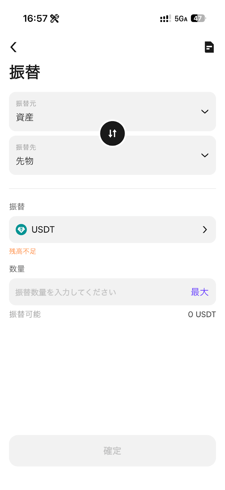 USDTが先物アカウントにない場合は、「利用可能額」の横にある【振替】ボタンをタップし、他のアカウントから先物アカウントへ資産を振替してください。