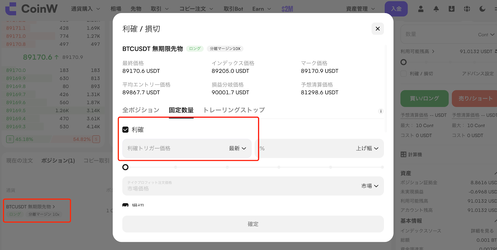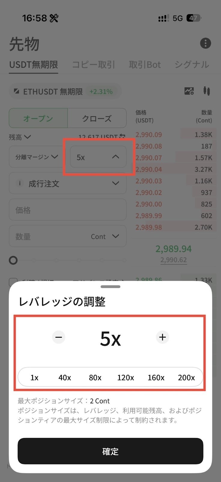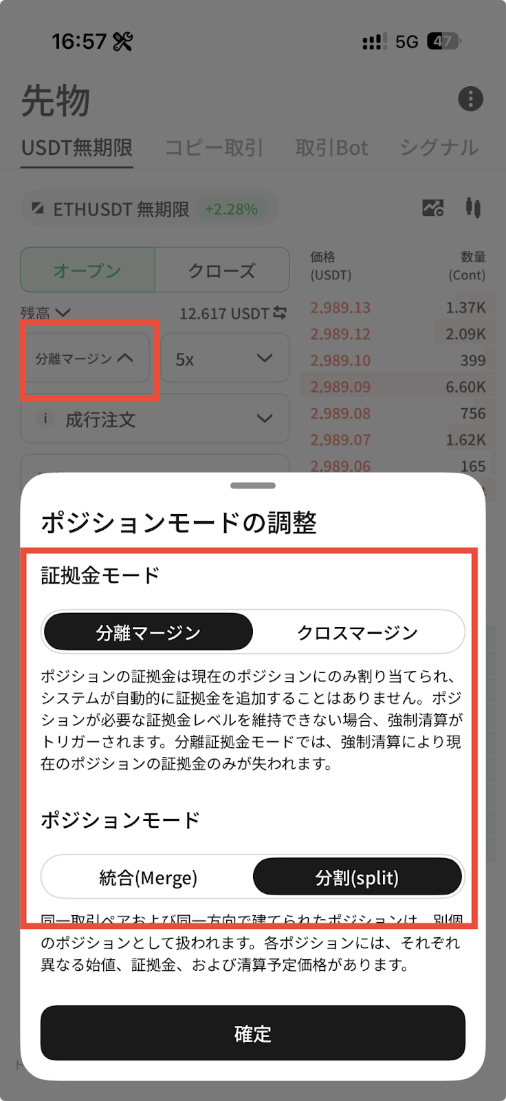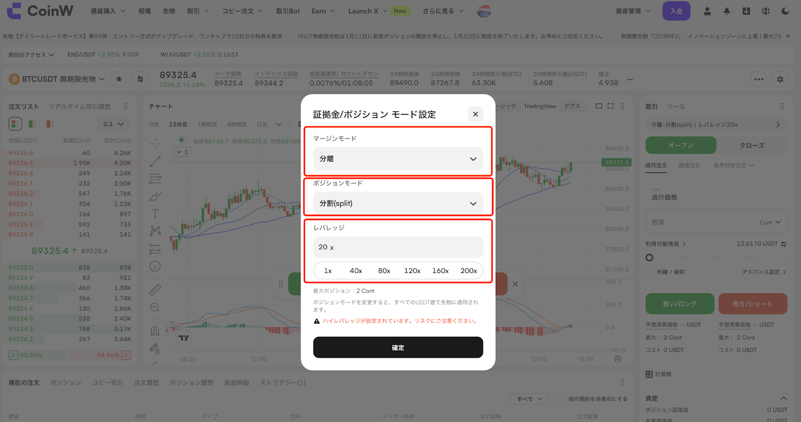 ポジションモードを選択し、レバレッジ倍率を設定します。