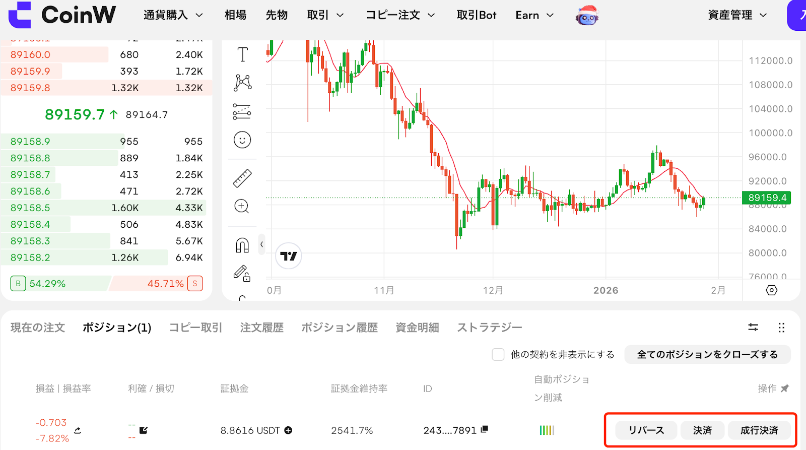 ポジションを維持するためには、一定割合の証拠金(維持証拠金)を保有する必要があります。証拠金が維持証拠金を下回った場合、当該ポジションは強制決済されます。CoinWでは、流動性不足や市場操作による影響を抑えるため、マーク価格方式を採用しています。