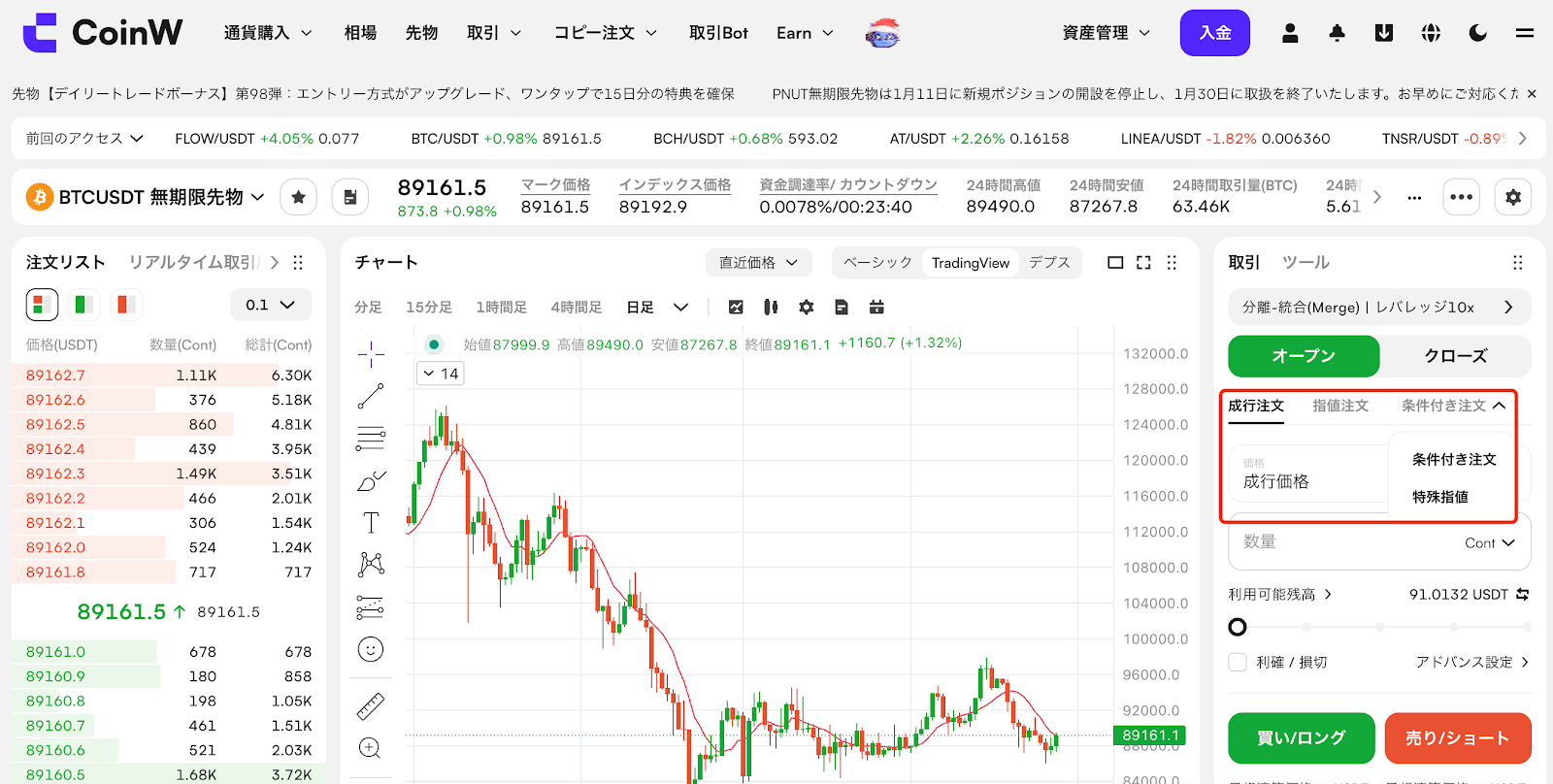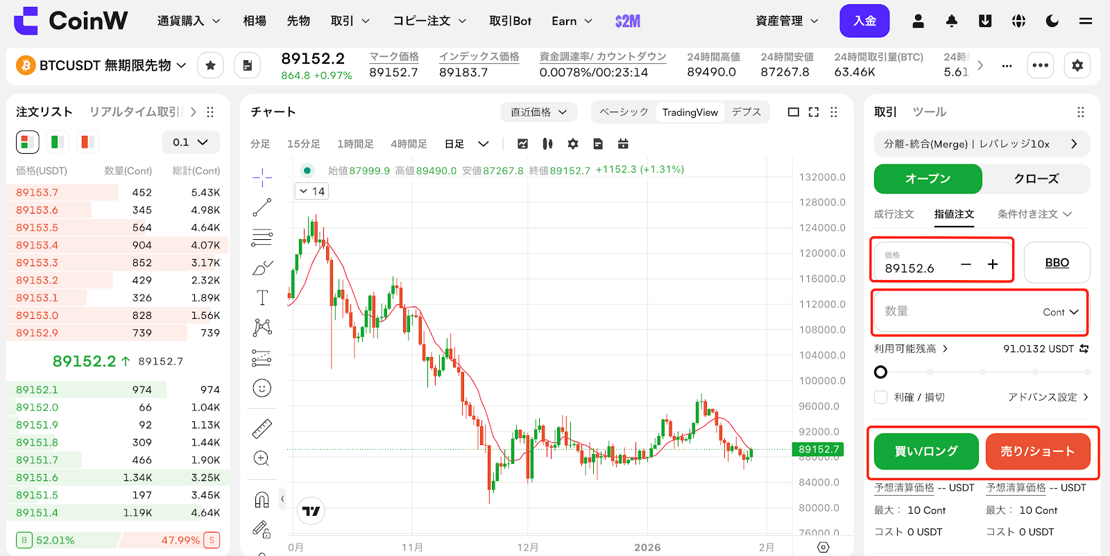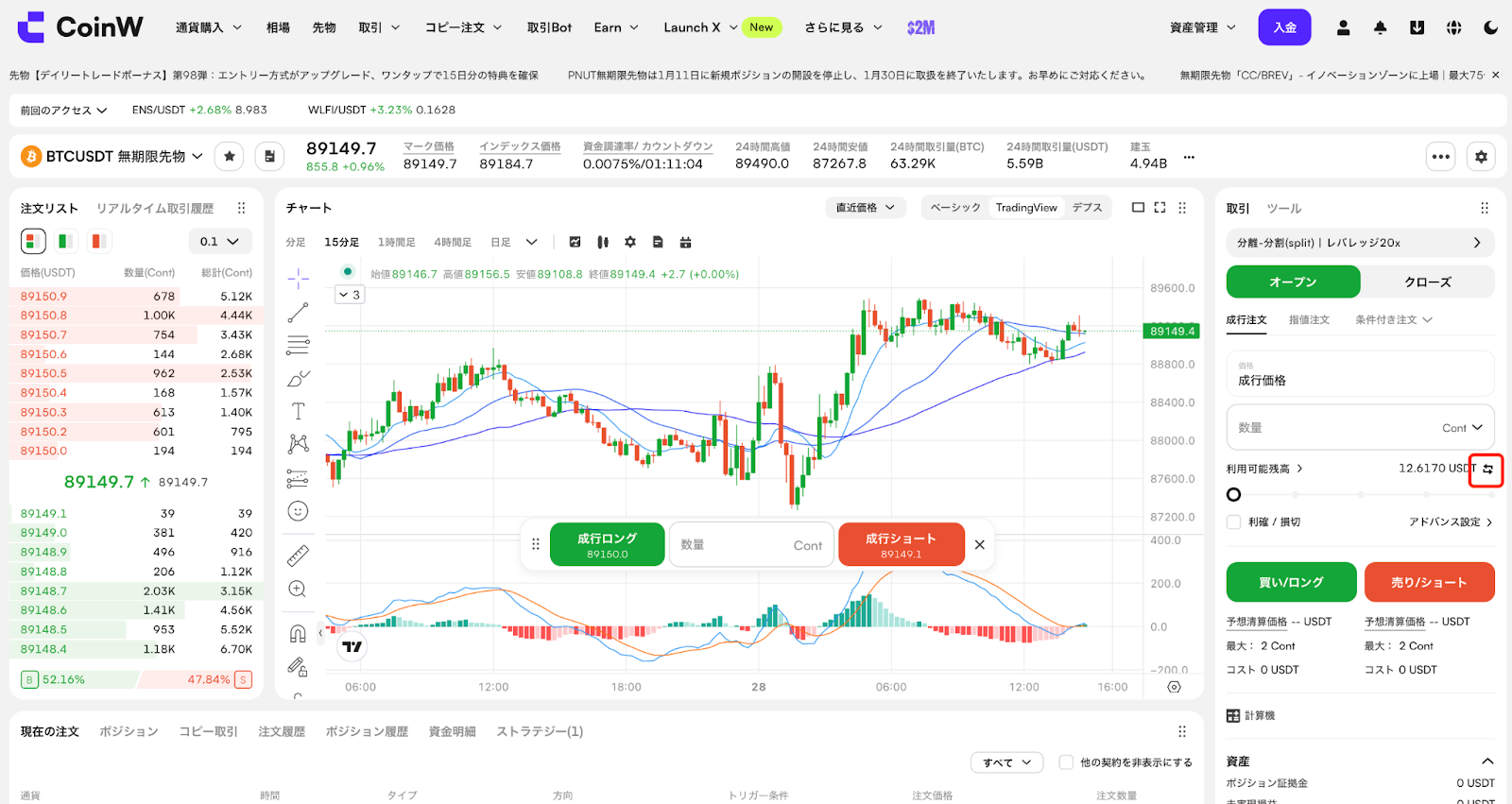 CoinWのUSDT建て先物は、USDTを証拠金として利用する先物取引です。証拠金自体の価格が安定しているため、損益計算が分かりやすく、1つの証拠金で複数の暗号資産ペアを取引できる点が特長です。