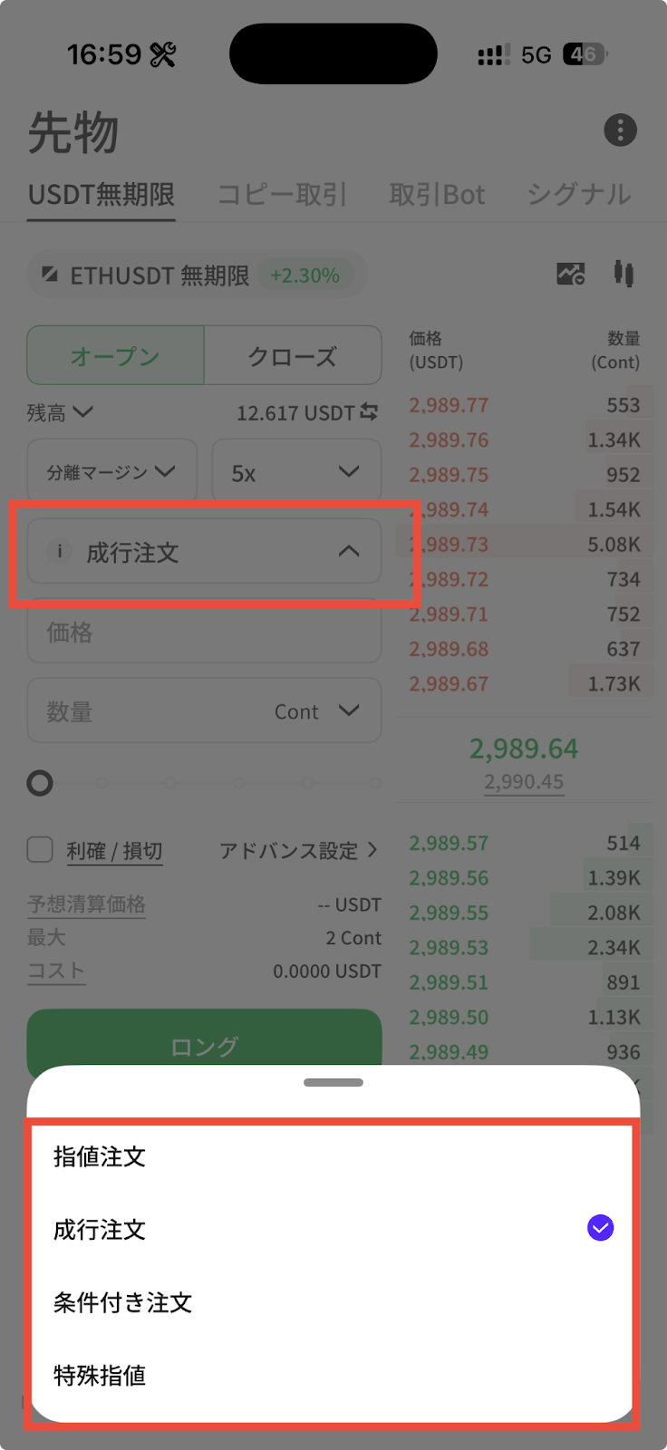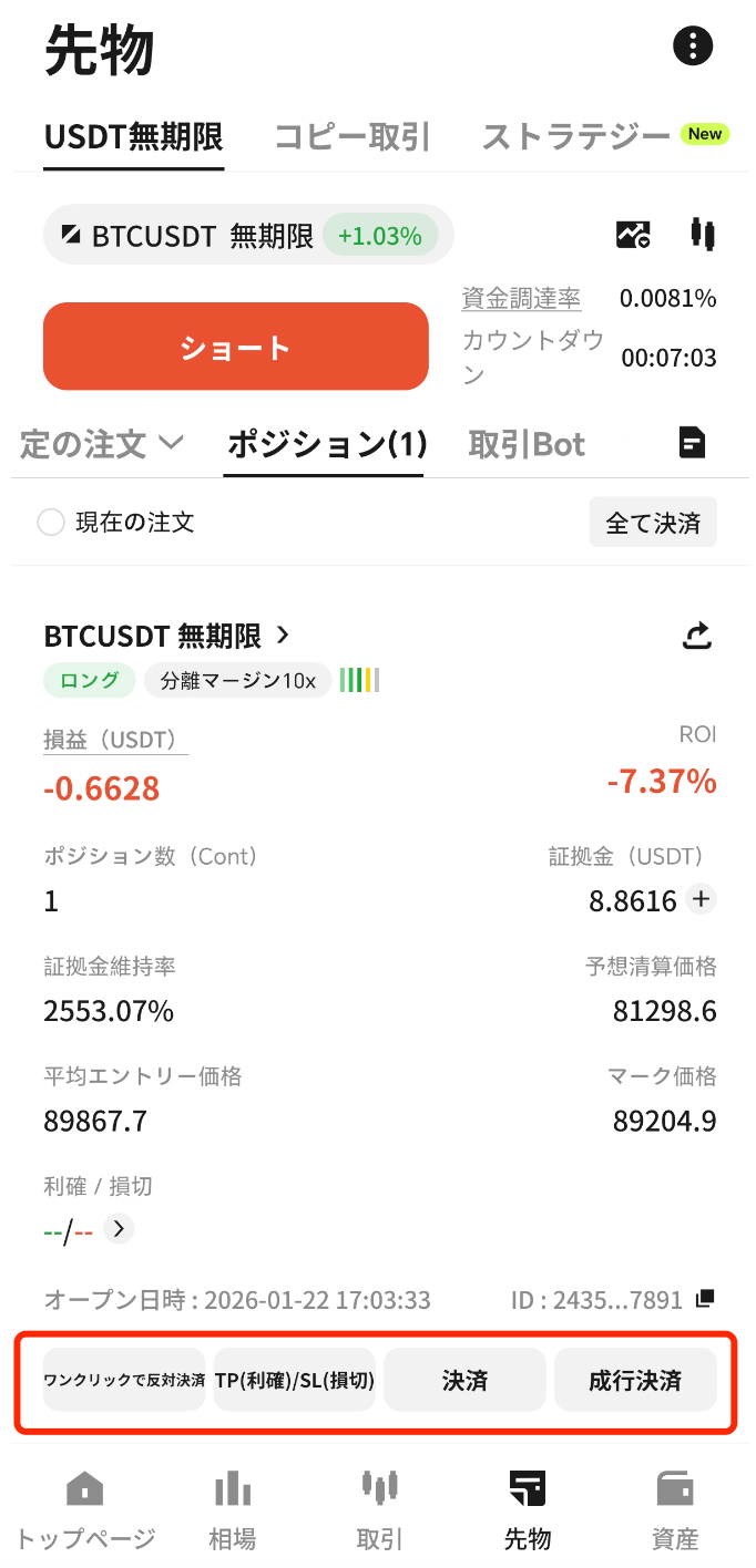 価格および数量を入力し、ポジション開設方向を確認したうえで、【買い(ロング)】または【売り(ショート)】をタップすると注文が完了します。