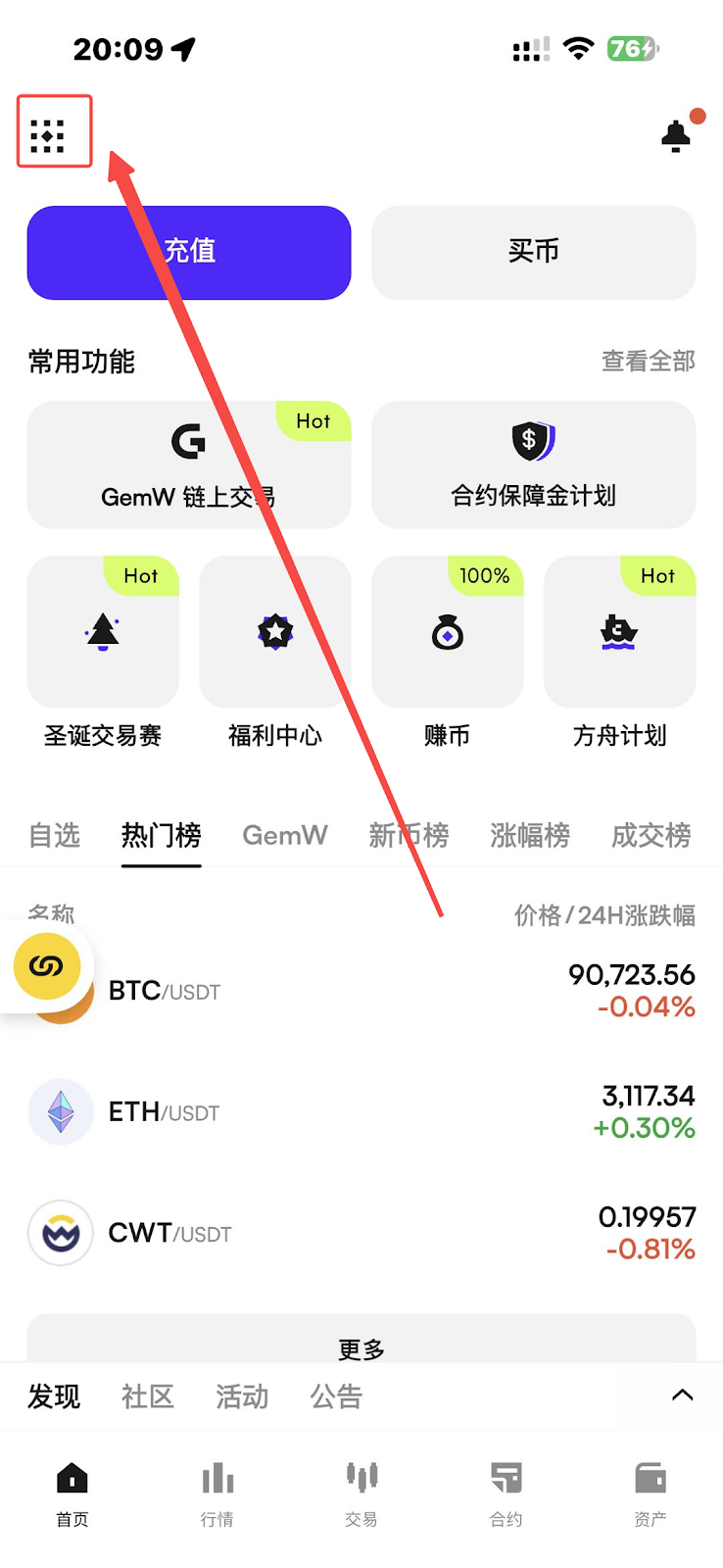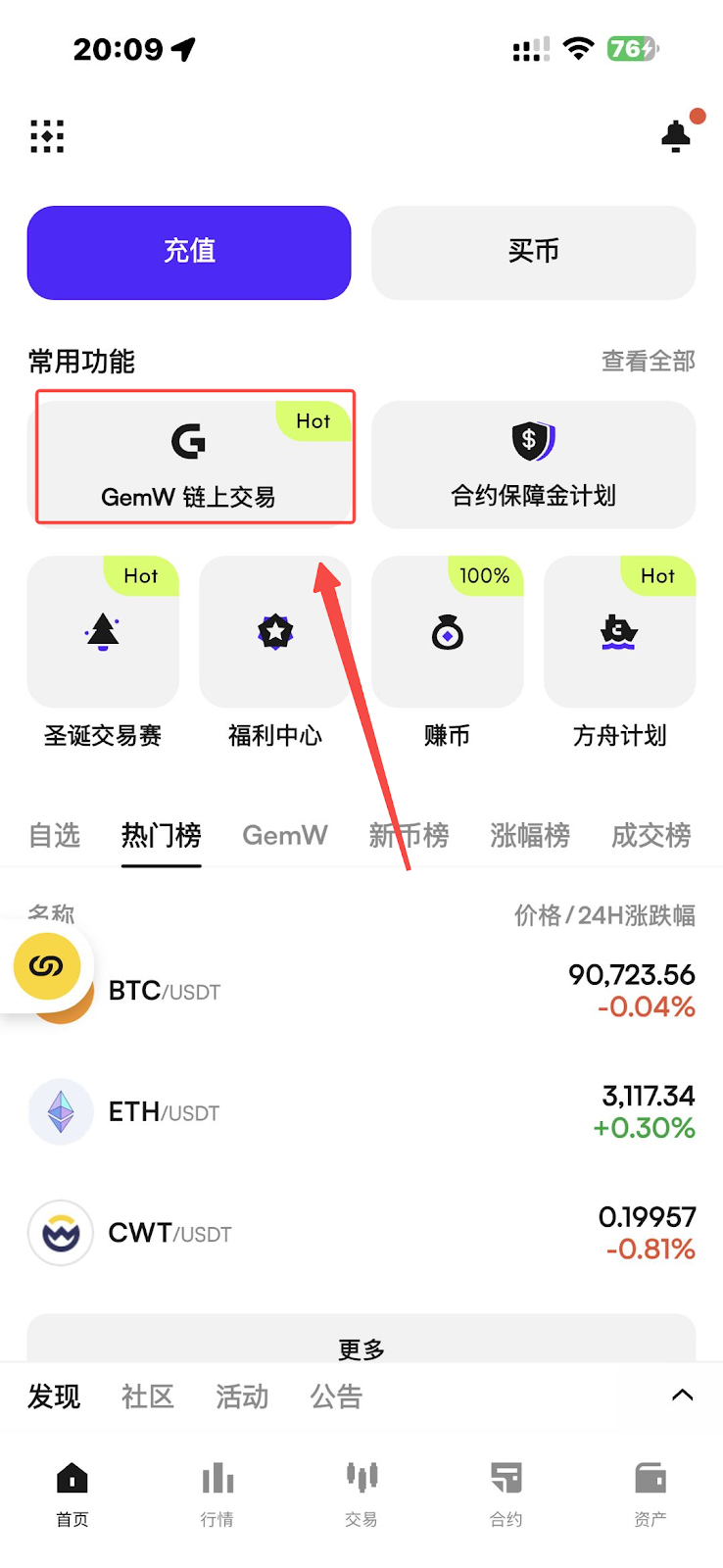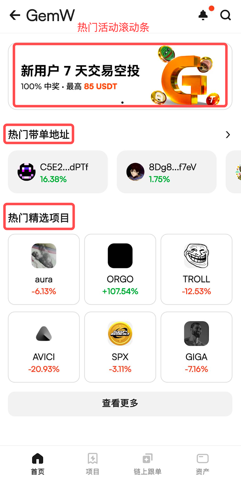 在 App 端 GemW 首页 顶部,你会看到平台最新推出的活动与交易优惠,例如注册奖励、交易激励、热门币种活动等。