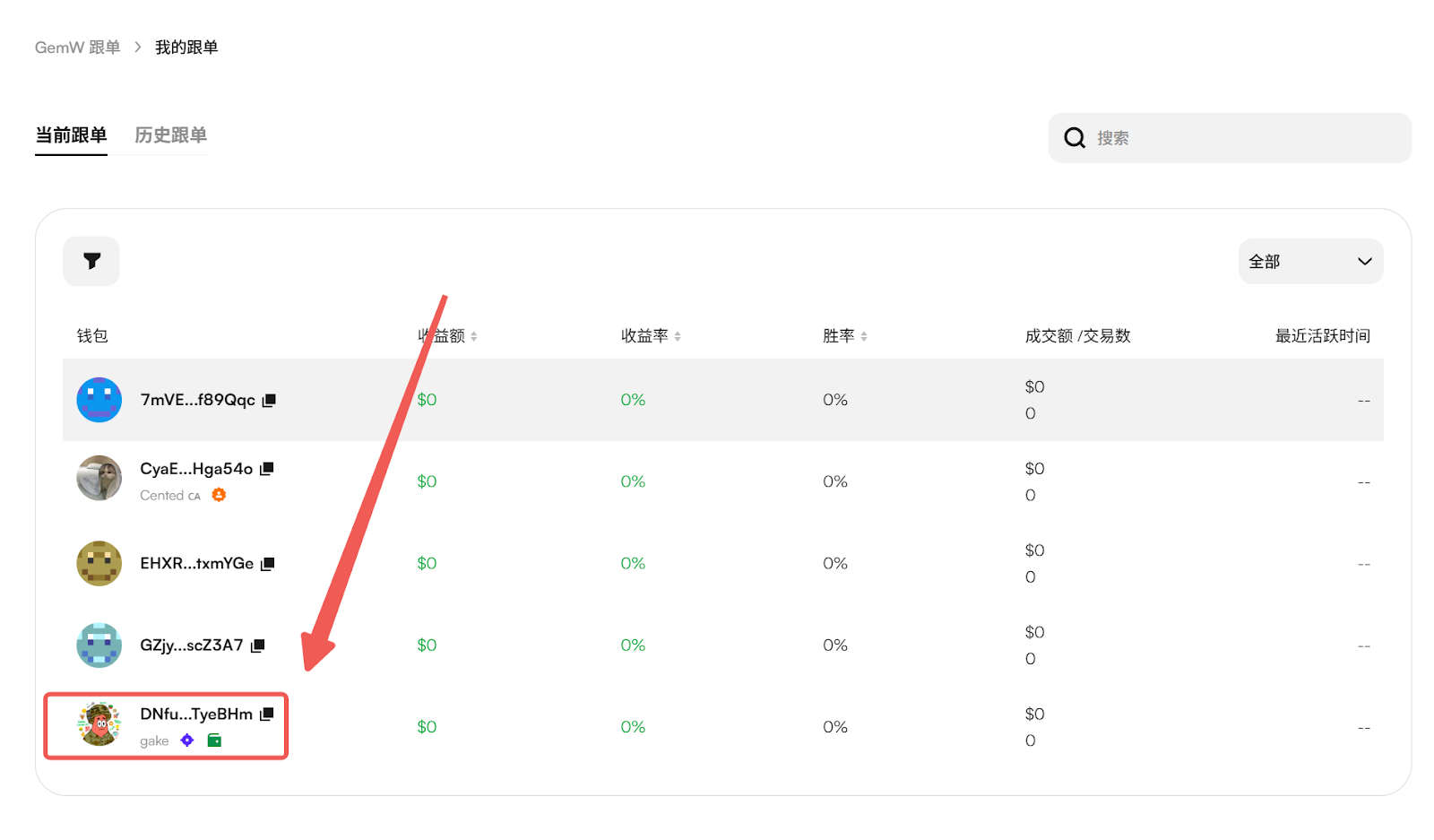 「全部」板块列出了 平台收录的一批活跃交易地址,这些地址一般根据交易频率、交易量或行为活跃度等指标筛选,是 GemW 当前链上最活跃的策略地址池。