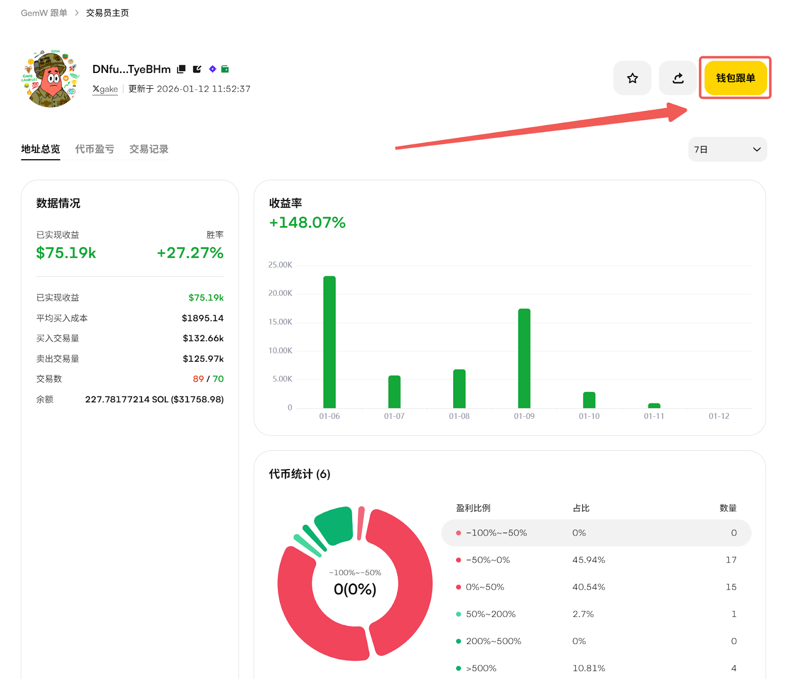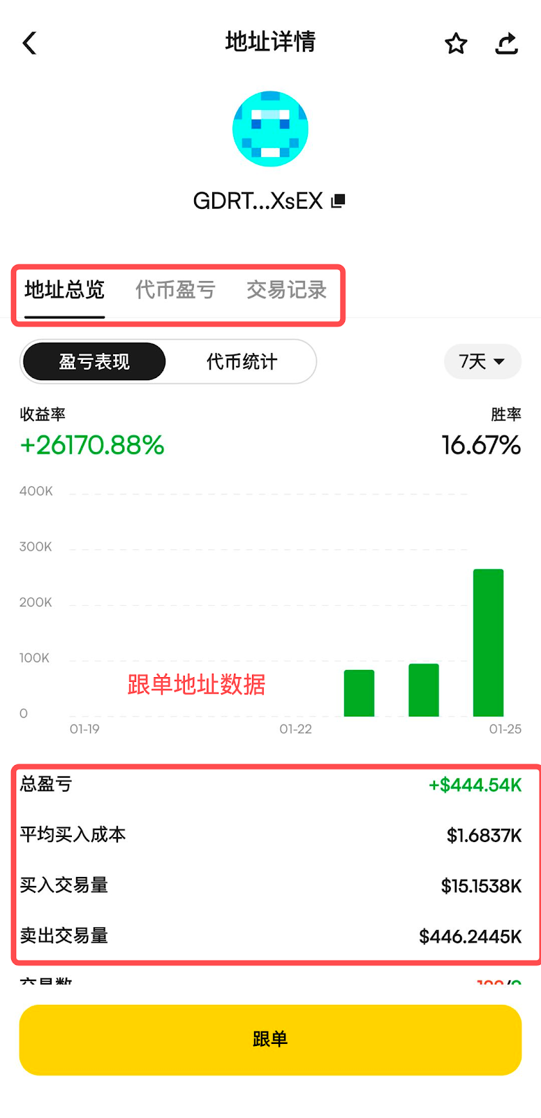 当你点击任一带单地址后,可以进入该地址的详情页面,页面分成多个数据视图,帮助你全面评估该地址的交易表现与策略特征。