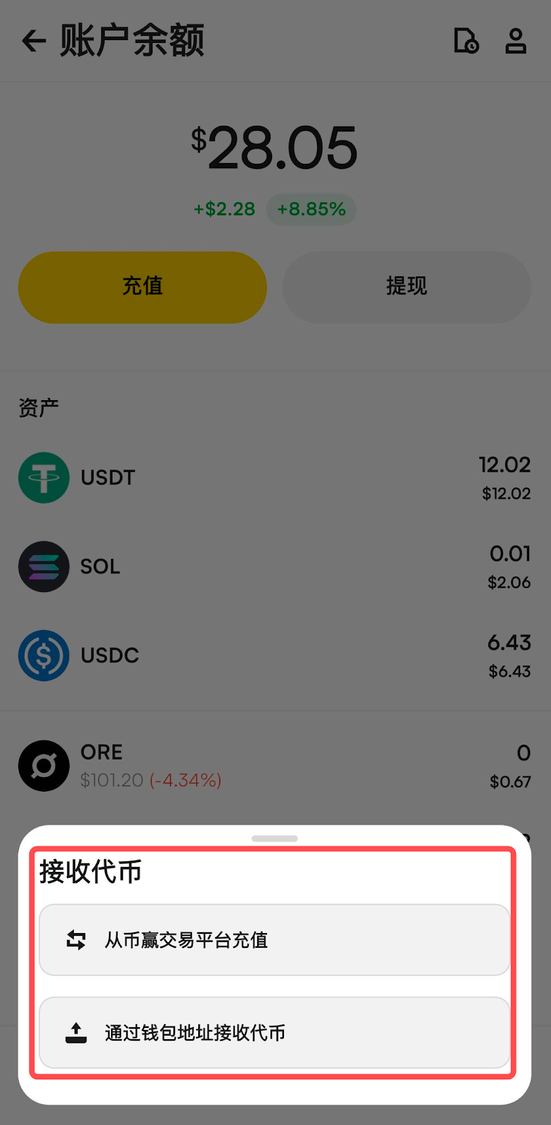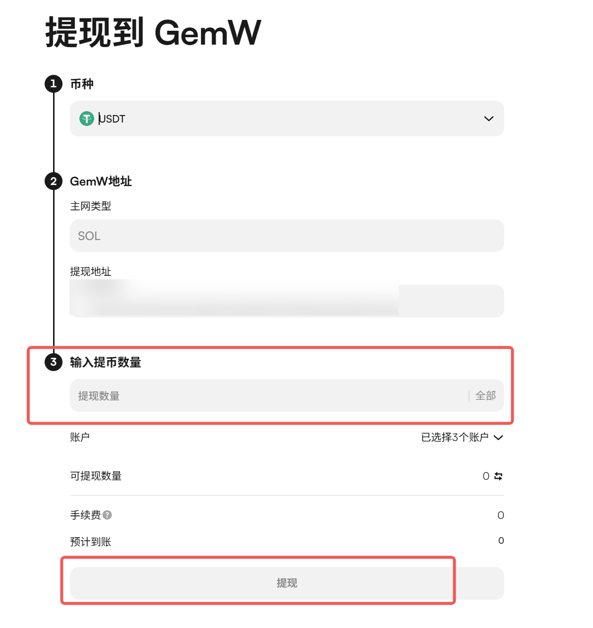 从链上钱包接收代币:使用钱包地址接收来自外部钱包的 USDT / USDC / SOL 等加密货币资产,完成转账后,资金会显示在 GemW 余额中。