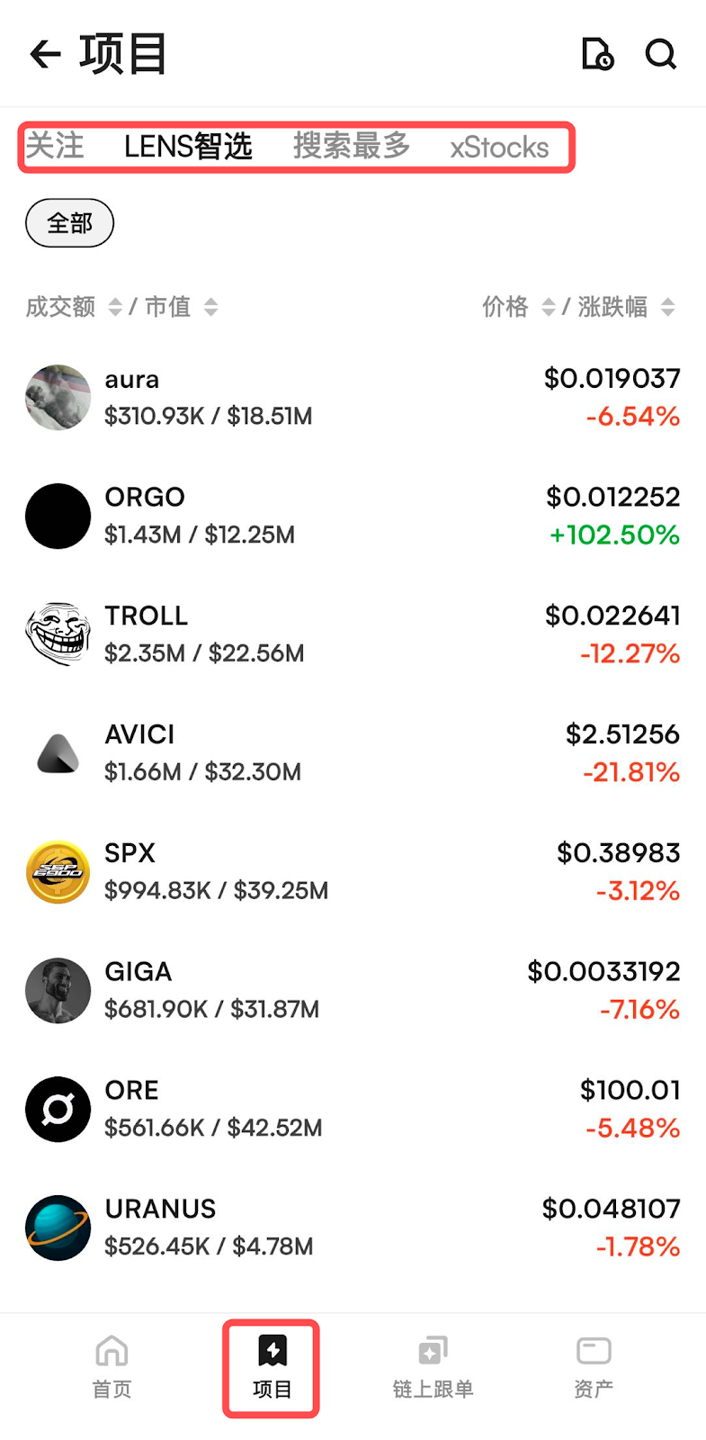 项目板块将代币按多种维度进行分类展示,方便用户操作: