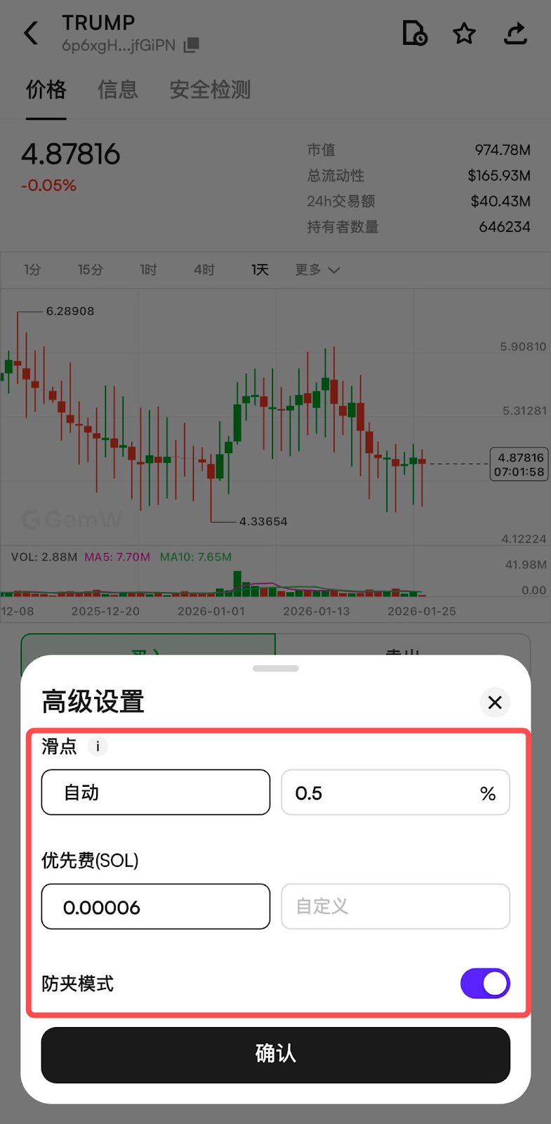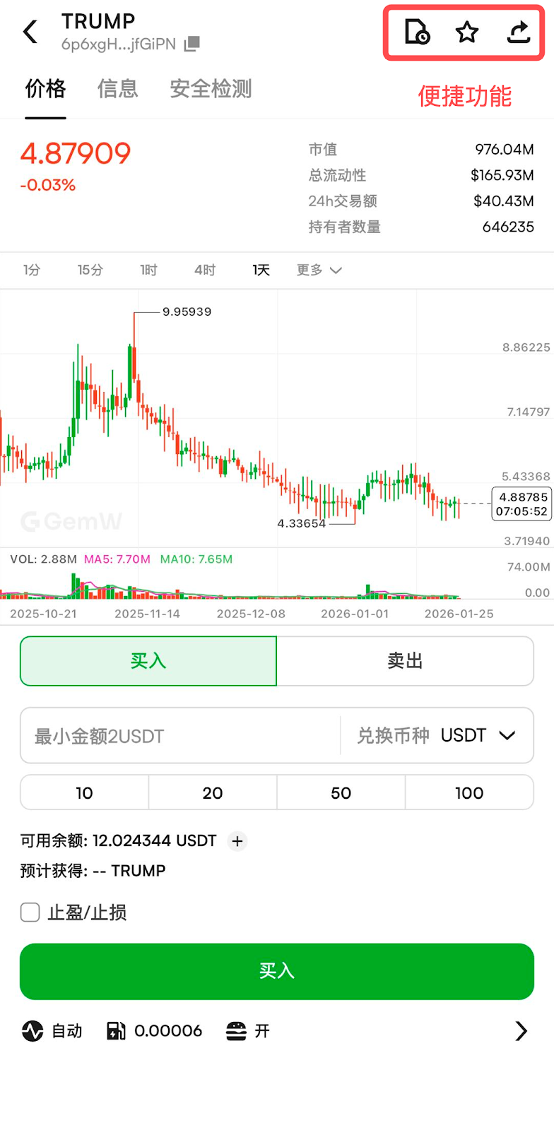 在交易页可以查看该代币的 实时 K 线图,支持不同时间周期切换,适合观察走势与技术分析。
