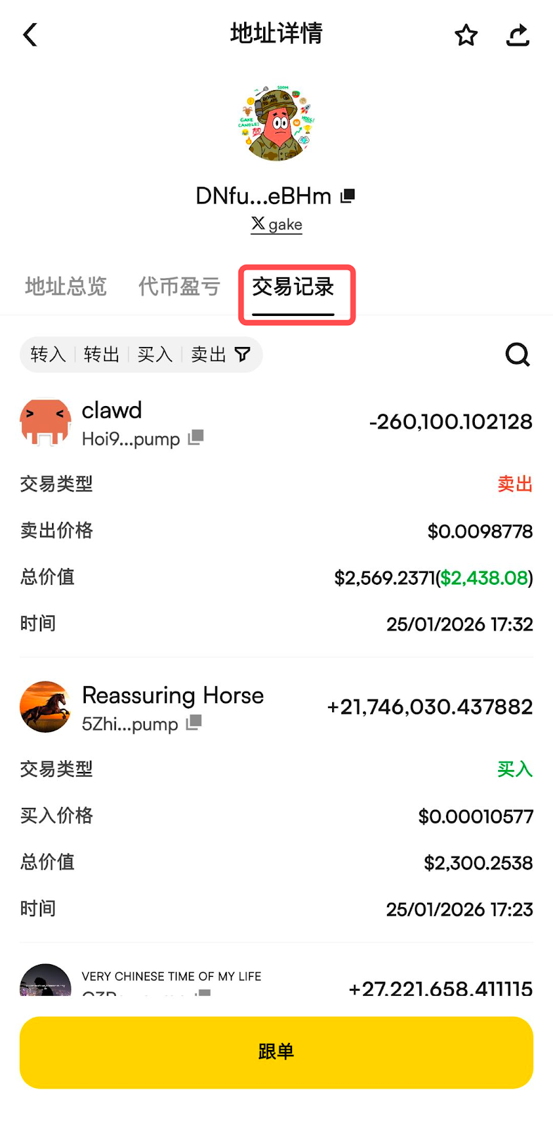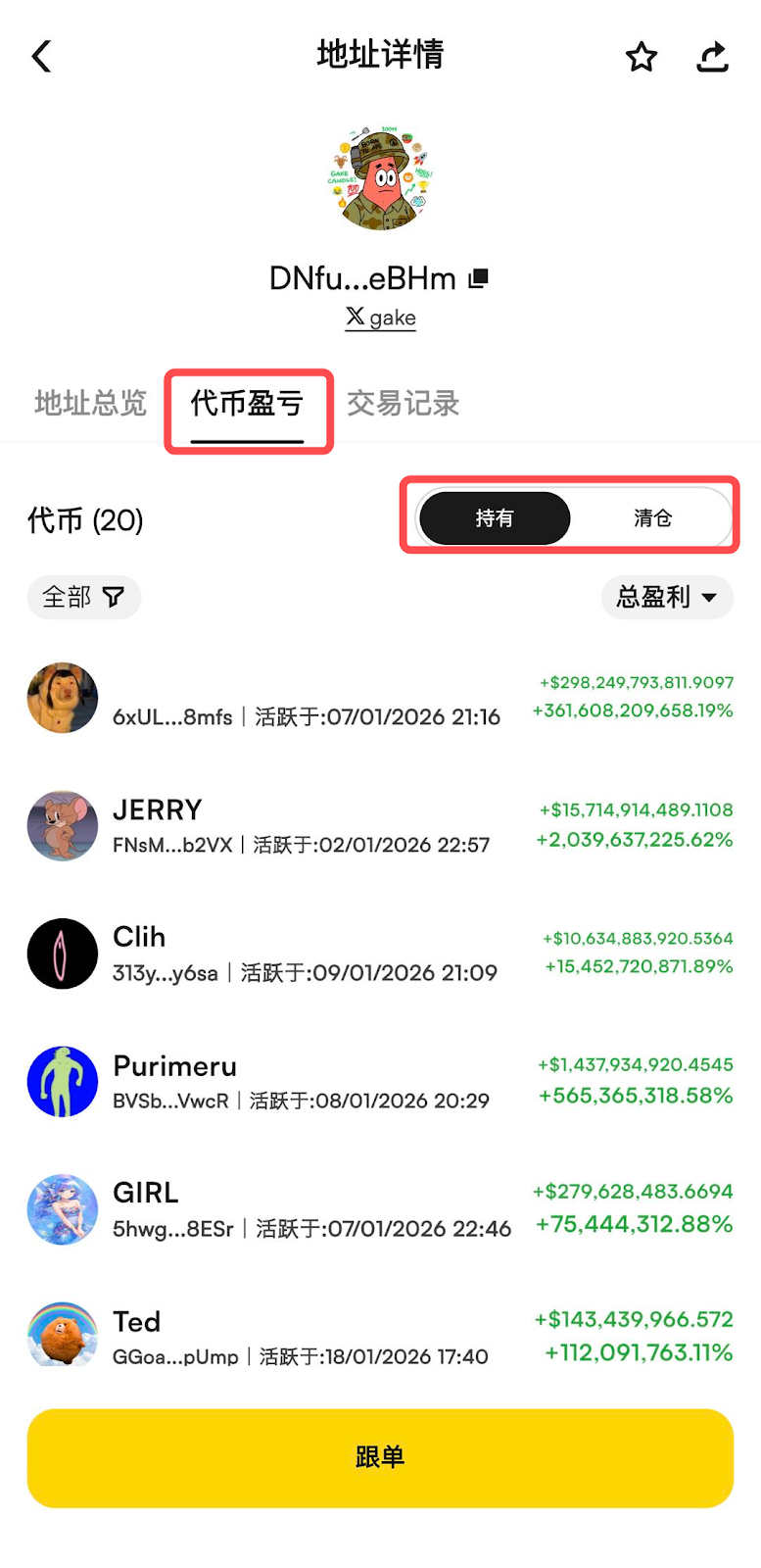 这里显示该地址已经平仓出的历史代币表现,包括卖出价格、盈利情况等,可以帮助你评估这位带单地址过往的交易收益能力。