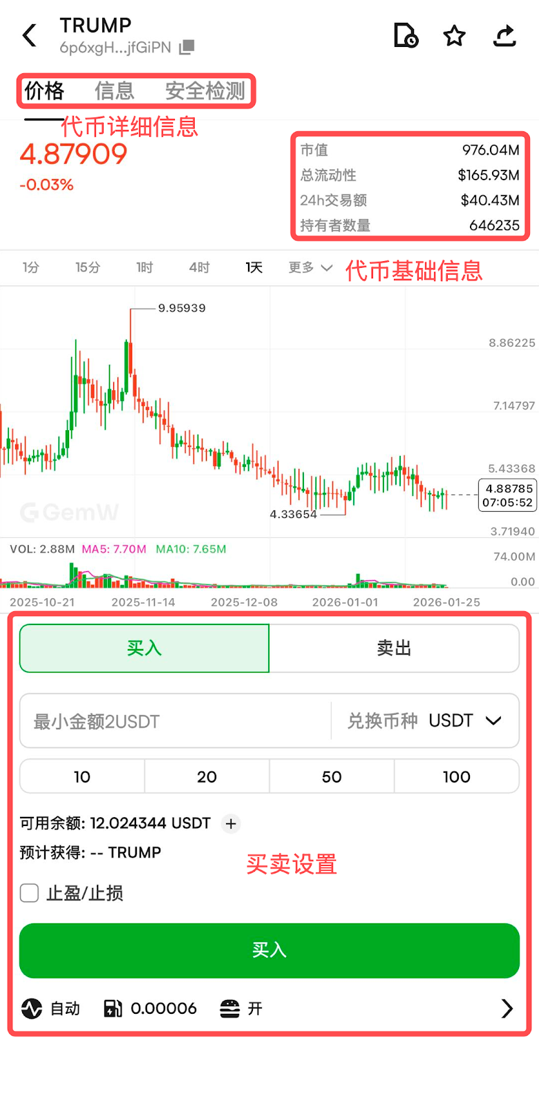 当用户点击某个代币后,会进入该资产的交易与信息页,主要功能如下: