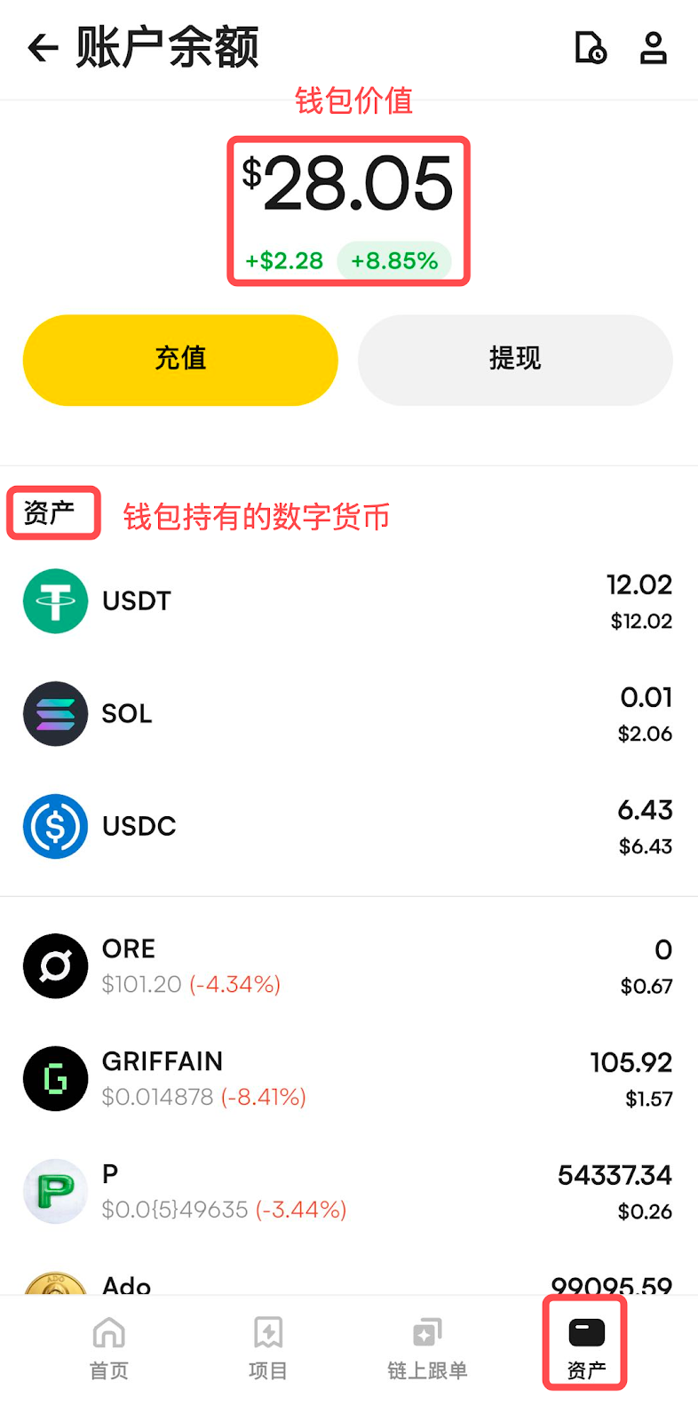 页面会按资产类型和数量直观展示每种代币的当前持仓余额与总资产估值,帮助用户快速了解自己的资金状况。