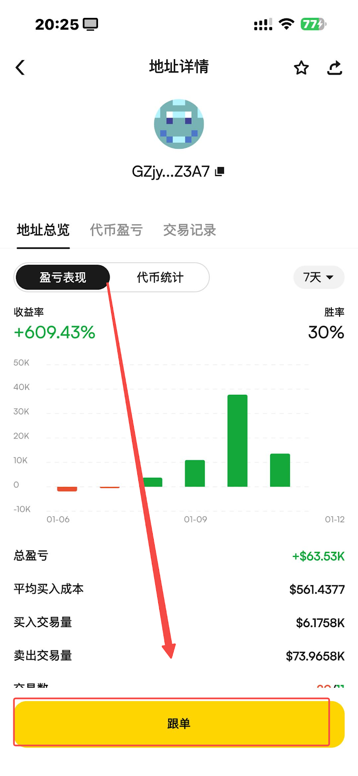 该视图汇总该地址 整体盈亏表现与持有代币统计,并支持自定义时间跨度(过去 7 天 / 30 天),帮助你快速判断该带单地址近期的交易状态。